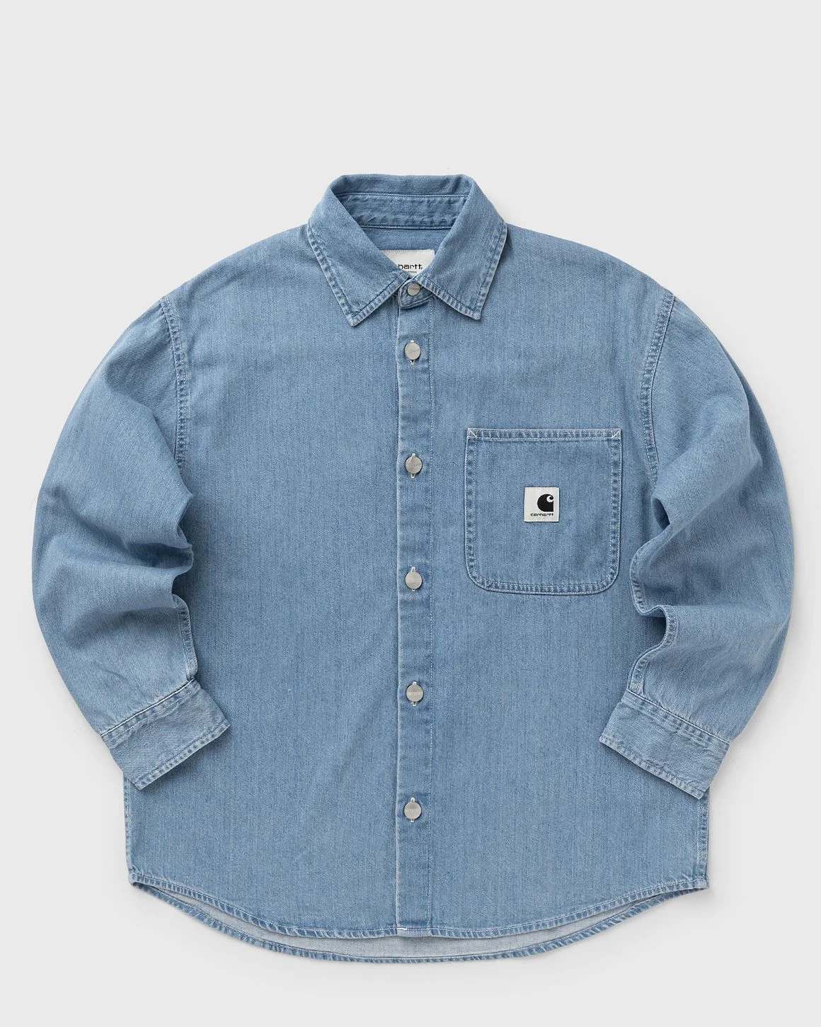 The loose-fitting Carhartt WIP L/S Marly Shirt is made from medium-weight cotton denim, which has been bleached to give it a lighter look. A woven square label completes the design. - Loose fit - Chest pocket - Buttons with logo - Square label Article Number: I035584-01.35 Gender: Women Color: Blue Material: 100% Cotton