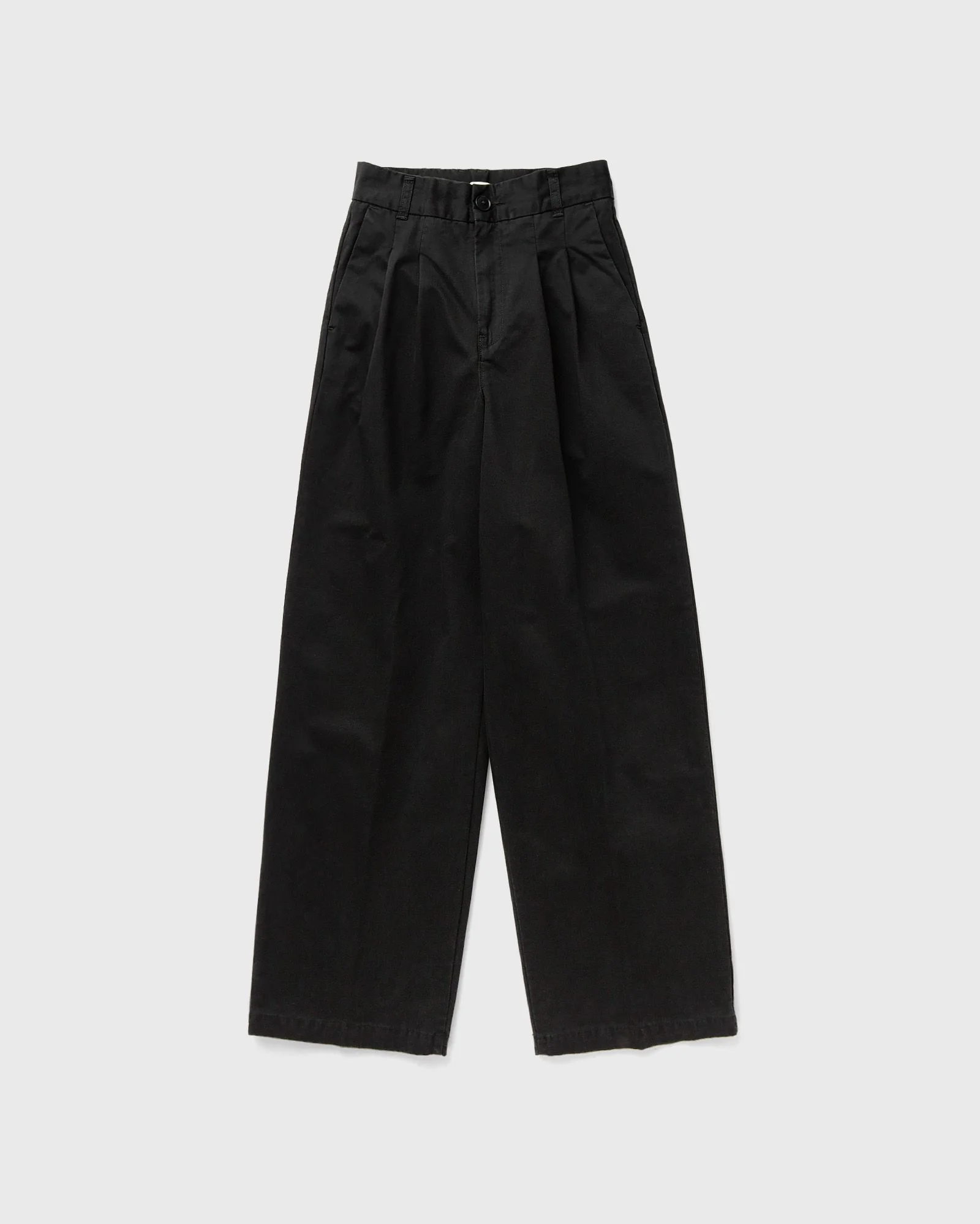 The Leola Pant by Carhartt WIP is made from a medium-weight cotton twill that has a stone wash for a softer feel. The pants have a loose fit with a high waistband. The style features double pleats and two side and back pockets, one of which is decorated with a woven square label. - Loose fit, high waist - Elastic waistband on the back - Double pleats - Two side pockets and two back pockets - Zipper - Square label Article Number: I033147-89.06 Gender: Women Color: black Material: 100% Cotton