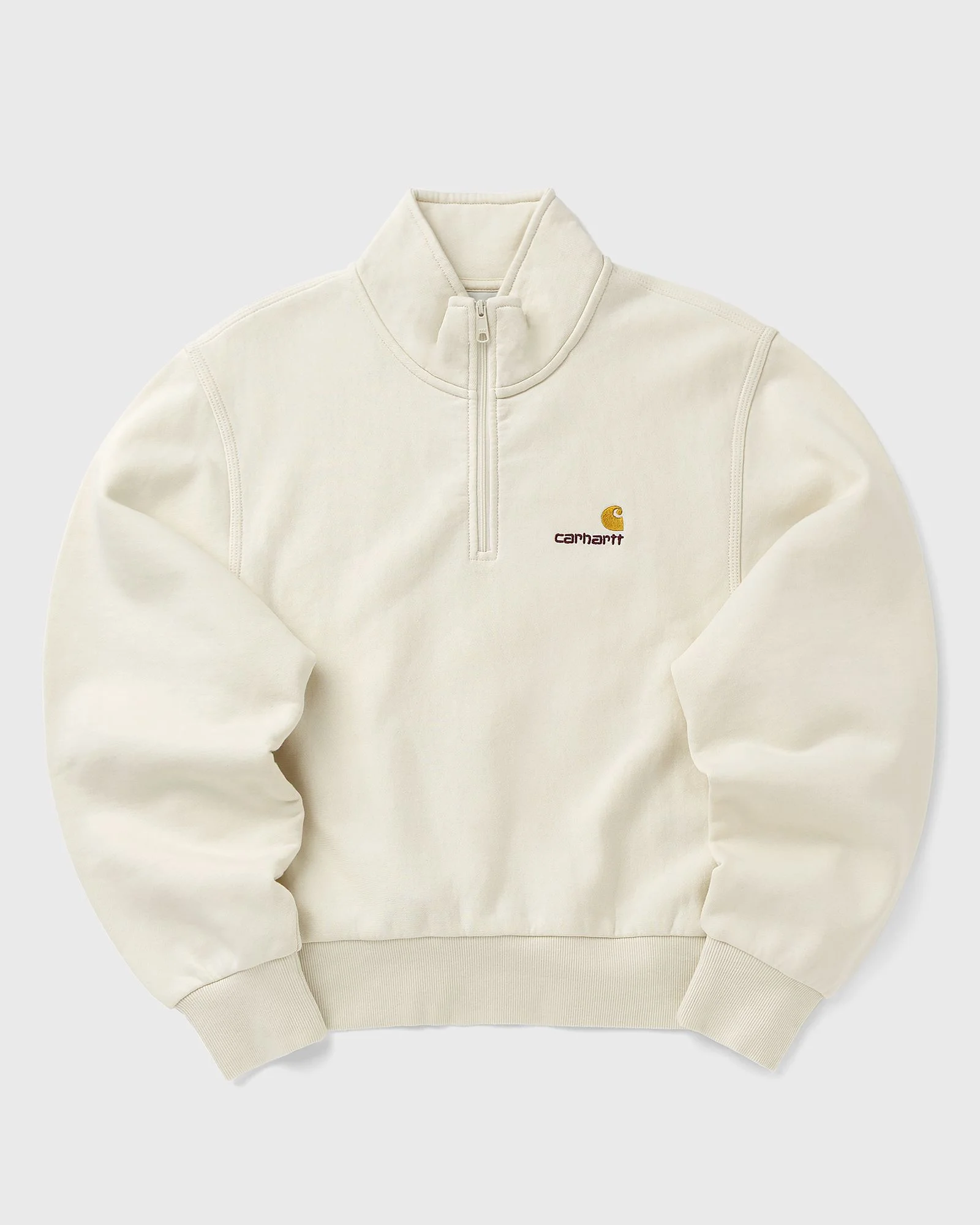 The Carhartt WIP American Script High Neck Sweatshirt has a boxy fit and is made from polyester-cotton jersey with a brushed, fleece-like interior. It has a high collar and a half-length button placket. There is an embroidered, two-tone American Script logo on the chest. - Boxy fit - Piece washed - Embroidered American Script logo Article number: I033827-05.XX Gender: women Color: Natural Material: 74% Cotton, 26% Polyester