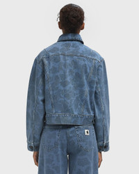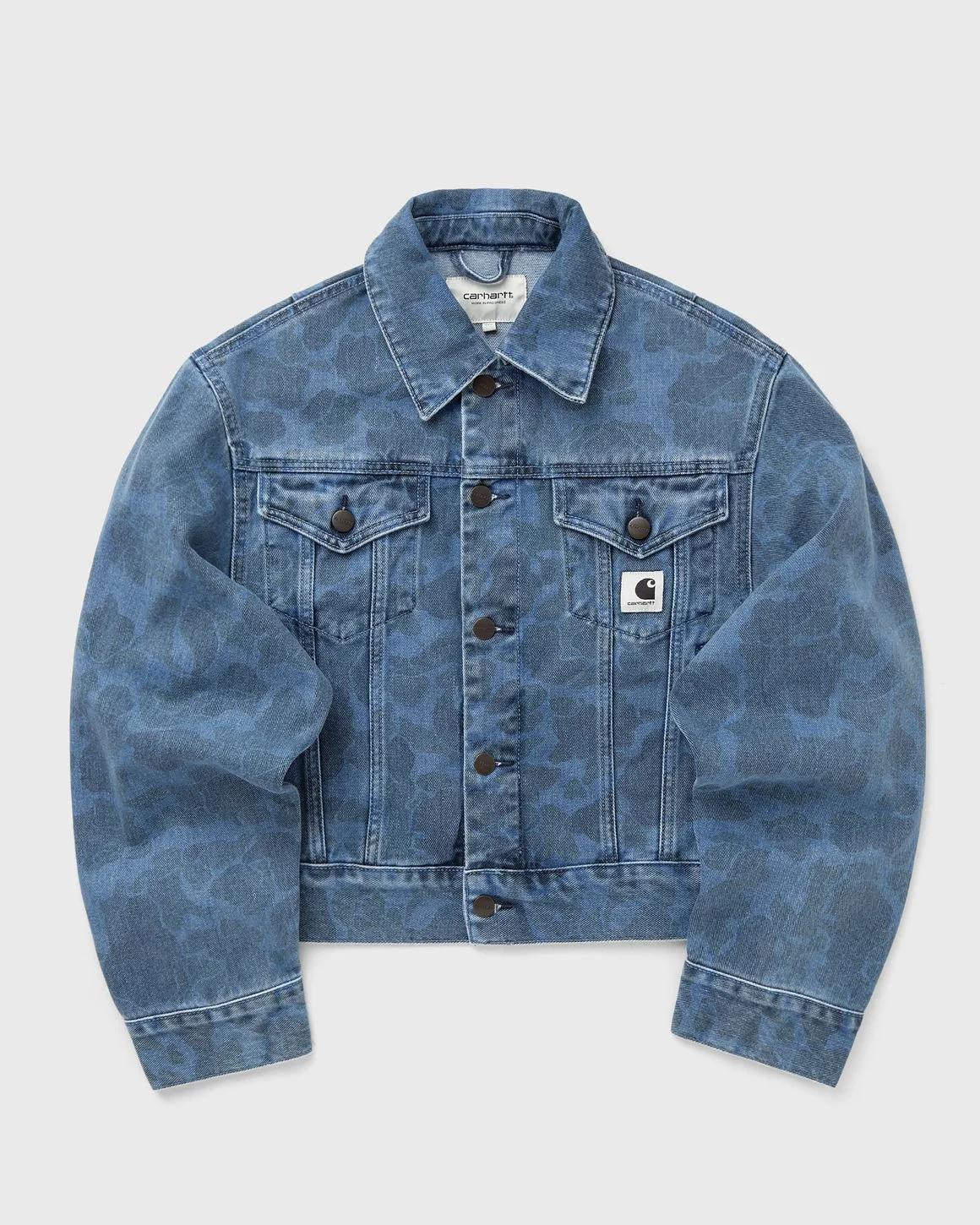 The Carhartt WIP Duck Orell Jacket is unlined and made from a heavyweight cotton denim with a camo print and worn finish. An adjustable waist and cuffs provide additional functional details. A faux leather square label on the back rounds off the design. - Adjustable cuffs and waist - Two buttoned breast pockets - Button placket - Faux leather square label This item is partly made of certified, recycled and sustainable materials, reducing the global amount of waste and conserving primary raw materials. Discover a wide range of sustainable items now at BSTN! Article Number: I033890-2I2.35 Gender: Women Color: CAMO DUCK, BLUE Material: 100% Cotton