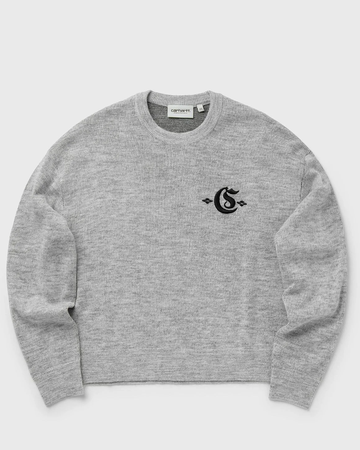 The Carhartt WIP Greatest Hits Sweater is made from a medium-weight polyacrylic blend and features an embroidered graphic on the chest. - Round neckline - Long sleeves - Embroidered graphic Article Number: I034391-00O.XX Gender: Women Color: ASH HEATHER / BLACK Material: 75% Acrylic, 10% Polyamide, 5% Viscose, 10% Wool