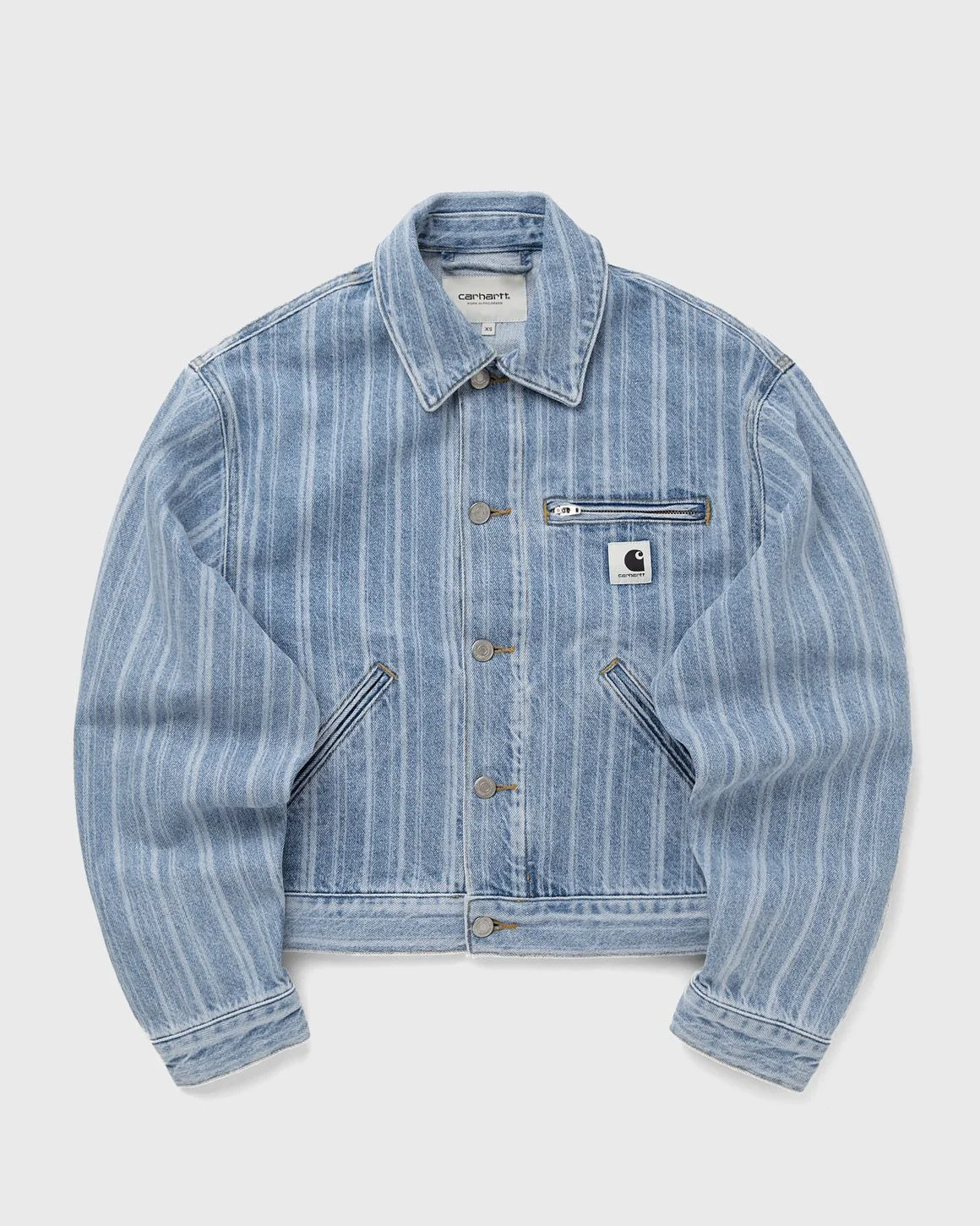 The Carhartt WIP Rylan Jacket is made from unlined cotton denim with stripes. The style fastens with buttons and has three slit pockets. A woven square label rounds off the design. - Unlined - Button placket - Three slit pockets - Square label Article Number: I035571-32H.12 Gender: Women Color: RYLAN STRIPE, BLUE Material: 100% Cotton