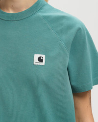The loose-fitting Carhartt WIP S/S Hudson T-shirt is made from a medium-weight cotton fabric with raglan sleeves. A chalk wash gives the style a sun-bleached effect and color differences in the details. A woven square label on the chest rounds off the design. - Loose fit - Short raglan sleeves - Square label Article Number: I035138-2ZU.5F Gender: Women Color: SAGUARO Material: 100% Cotton