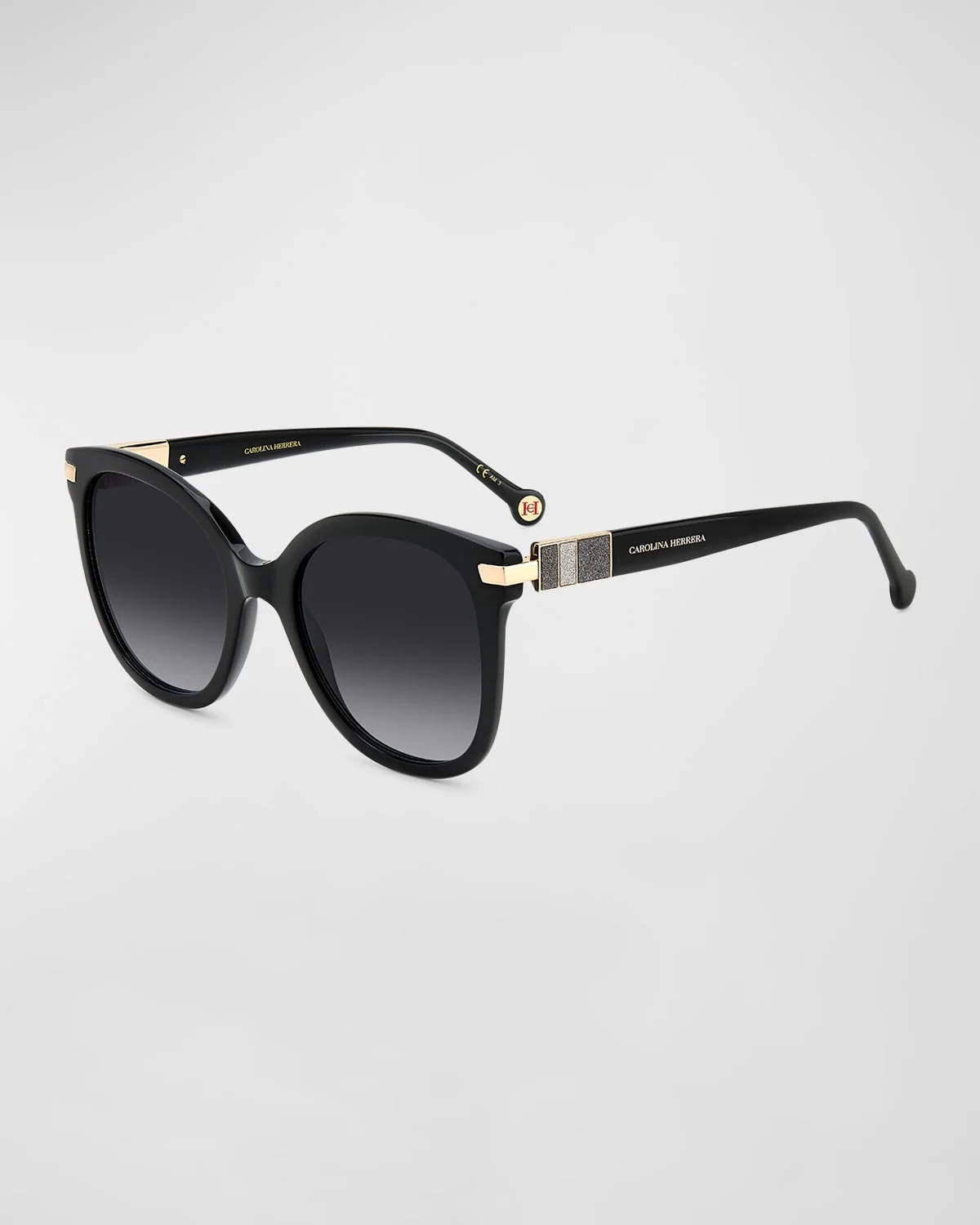 Carolina Herrera round sunglasses in acetate Lens/bridge/temple (in mm): 5521145 Gradient lenses Saddle nose bridge Glitter accents on hinges Logo on temples Thin, tapered arms Wipe clean 100% UVA/UVB protection Imported