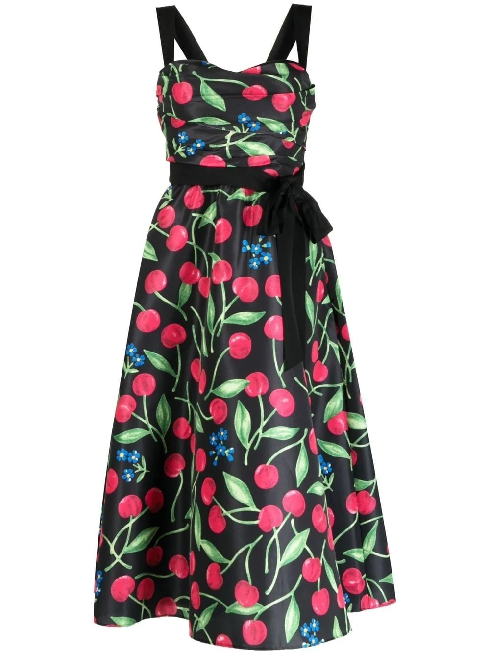 all-over cherry-print dress black/red all-over cherry print tied waist sweetheart neck sleeveless mid-length Made in Italy Composition Polyester 100% SIZE & FIT Model measurements Height 5 ft 11 in(1.8 m) Bust/Chest 28.34 in(72 cm) Hips 35.43 in(90 cm) Waist 23.62 in(60 cm) Measurement HIPS 56.69 in(144 cm) LENGTH 49.21 in(125 cm) WAIST 30.7 in(78 cm) FittingInformation This piece fits true to size. We recommend you get your regular size Designed for a close fit at the bust and waist, but loose at the hip Made with a mid-weight non-stretch fabric Washing instructions Dry Clean Only