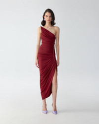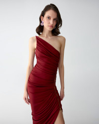 Crafted from Rioja-red jersey, this asymmetric dress drapes from a single shoulder with delicate side ruching that defines the silhouette. A gleaming gold zipper reveals a flash of leg. Side slit Exposed zip fastening at the side SKU S2615N501JRS SIZE & FIT Close fit, midi length Midweight jersey Model is 180cm/ 5’7” and is wearing a US 2 Bust: 29" Waist: 24" Hips: 33.5" COMPOSITION & CARE 96% Viscose 4% Elastane Washing Instructions Dry Clean Only Made in China