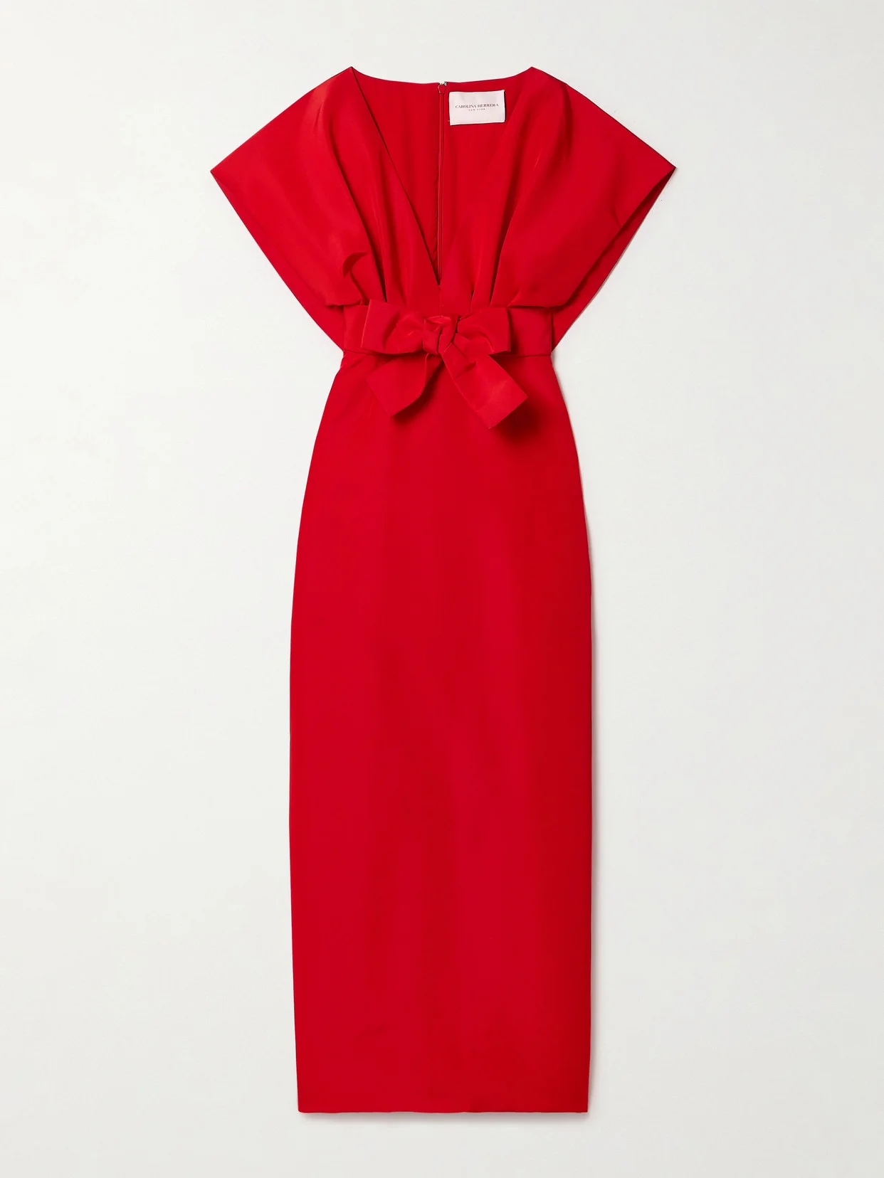 Designed in an elegant column silhouette, Carolina Herrera's gown is made from structured silk-faille in a fiery 'Lacquer Red' shade. It has a dramatic plunging neckline framed by voluminous armholes and a bow-embellished belt. Finish the look with tonal accessories.