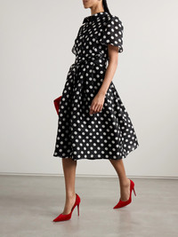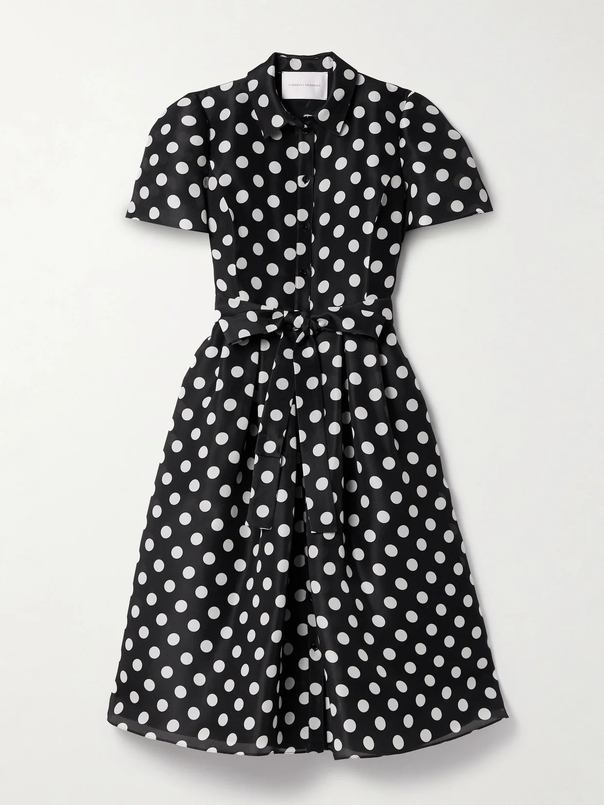 Carolina Herrera's shirt dress is reminiscent of vintage styles, with its polka-dot pattern and timeless shirt-style design. Made from silk-gazar, it has gently puffed sleeves and a self-tie belt that cinches and defines the waist. The full skirt creates pretty movement as you walk.
