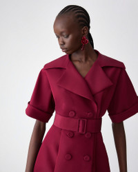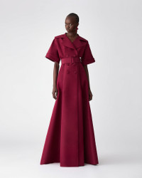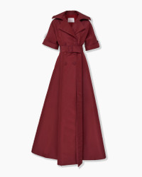 Crafted from lustrous silk faille, this short-sleeve gown channels classic trench coat styling with notched lapels, a double-breasted front, and a self-belt. The nipped-in waist flows into a dramatic, floor-length skirt, creating a striking silhouette. Cuffed sleeves Side pockets SKU F2511N726SFA SIZE & FIT Close-fitting bodice, voluminous skirt Midweight silk-faille Model is 179cm/ 5’11” and is wearing a US 2 Bust: 29.5" Waist: 22" Hips: 34.5" COMPOSITION & CARE 100% Silk Washing Instructions Dry Clean Only Made in Italy