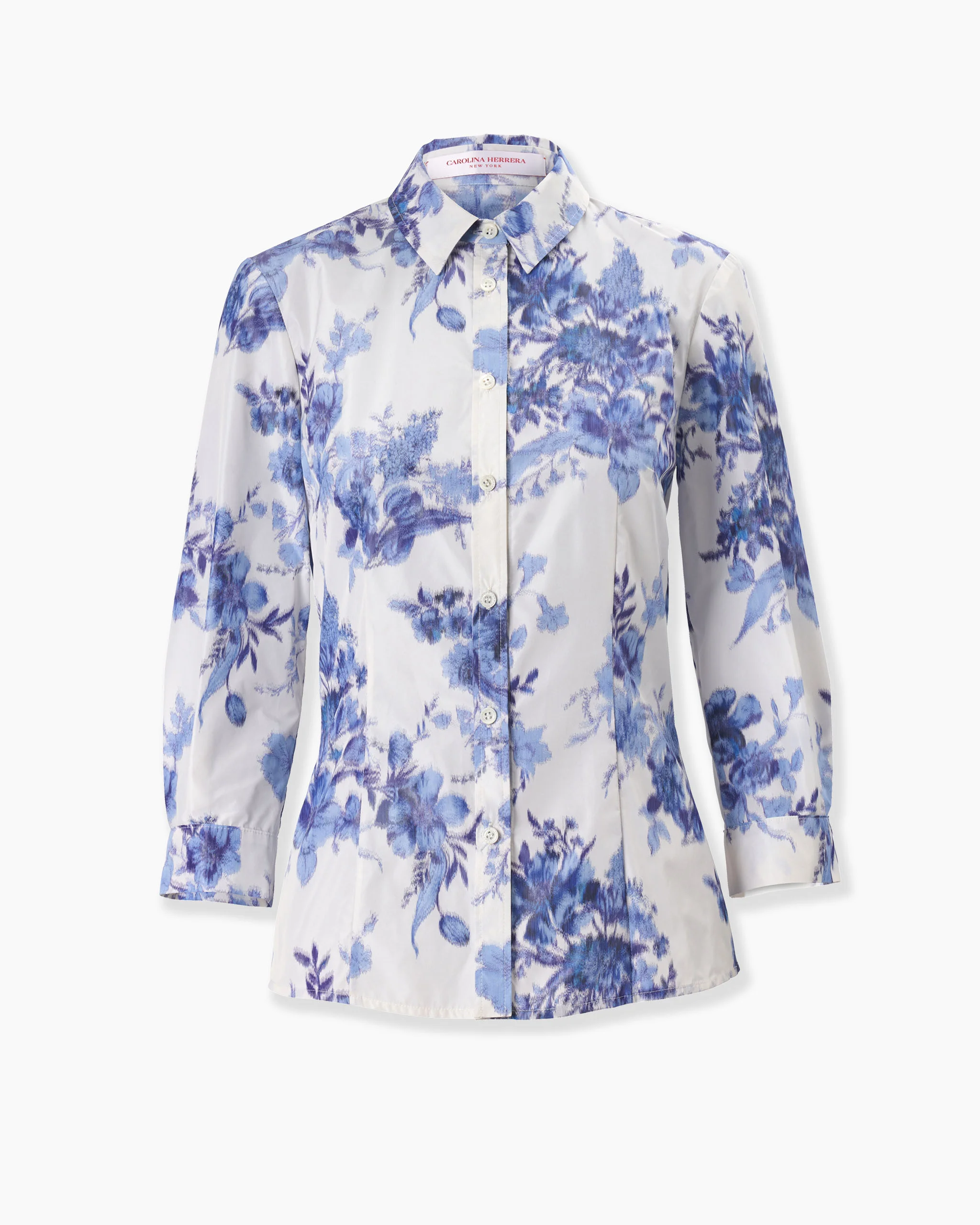This taffeta Icon shirt is decorated with a floral print inspired by vintage porcelain. Chine printing gives the pattern a soft, blurred finish. Three-quarter sleeves Buttoned front SKU E2511N215CBT SIZE & FIT Regular Fit Lightweight non-stretchy taffeta Model is 180cm/ 5’11” and is wearing a US 2 Bust: 31" Waist: 23" Hips: 34.5" COMPOSITION & CARE 100% Polyester Washing Instructions Dry Clean Only Made in Italy