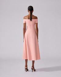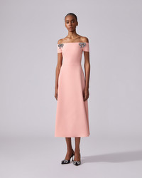 Crystal bow appliques bring vintage glamour to this off-shoulder dress, cut from fluid crepe with a fitted bodice and a flared A-line skirt. SKU P2511E537SFR SIZE & FIT Fitted bodice with A-line midi skirt Midweight stretch-crepe Model is 178cm/ 5’10” and is wearing a US 2 Bust: 31" Waist: 23" Hips: 34" COMPOSITION & CARE 92% Polyester 8%Polyutherane Washing Instructions Dry Clean Only Made in United States of America