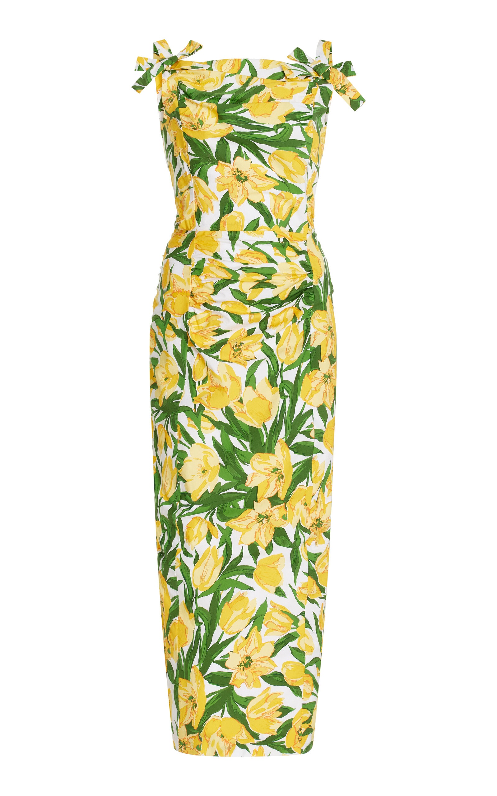 Inspired by the “self-assured” Carolina Herrera woman, Wes Gordon continues to reinterpret—yet still honor—the house’s iconic codes reimagining signatures with fresh whimsy. This cocktail dress is crafted from a floral stretch-cotton that fits tight to the form and features ruches throughout the waist. Slim ties adorn the straps for a final feminine garnish. PRODUCT DETAILS - Pre-Fall '24 - Concealed zip fastening along back - Composition: 97% Cotton, 3% Elastane - Dry clean - Made in Italy SIZE & FIT - Our model is wearing a size US 2 - Model is 5'9.5" with a 32" bust, 23" waist, and 34" hip - Designed for a slim fit