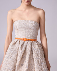 This dazzling ball gown is cut from fil coupe with a textured floral pattern. Its champagne-gold lurex threads shimmer beautifully as they catch the light. Strapless Lined SKU P2511N708FFL SIZE & FIT Close-fitting bodice, voluminous skirt Midweight organza Model is 180 cm/ 5’11” and is wearing a US 2 Bust: 32" Waist: 23" Hips: 35" COMPOSITION & CARE 52% Nylon 48% Metallised Polyester Washing Instructions Dry Clean Only Made in United States of America