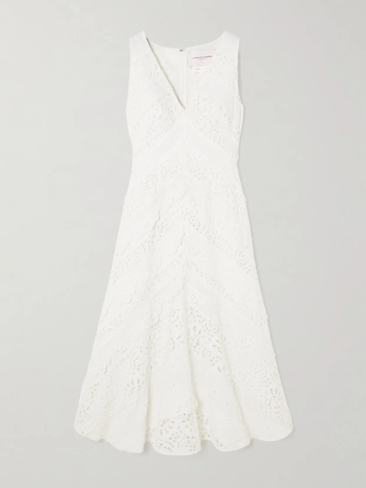 EXCLUSIVE AT NET-A-PORTER. Carolina Herrera's dress is made from panels of pretty broderie anglaise cotton - they're strategically placed to draw the eye in, streamlining your silhouette. It's fully lined for coverage and has a V-neck perfect for showing off a few dainty necklaces. Since it's part of the designer's exclusive summer-inspired capsule, we suggest accessorizing with a raffia bag.