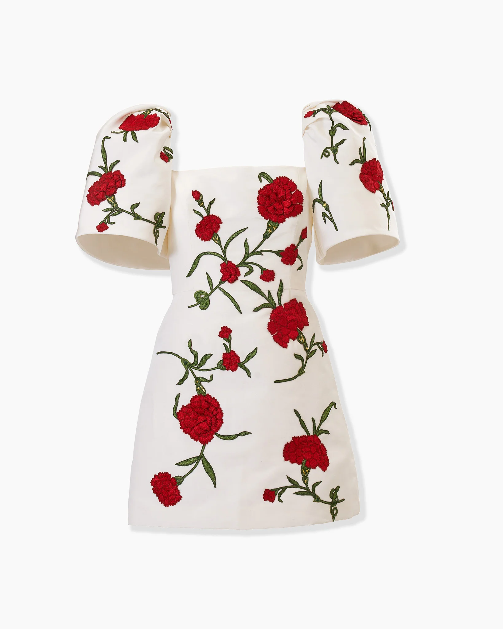 Cut from silk faille, this mini dress is richly embroidered with bold red carnations. A square neckline frames the dramatic bell sleeves, inspired by the traditional dress of Madrid’s Chulapas – the city’s iconically stylish women. Runway style Concealed zip fastening at the back SKU S2611E508SFA SIZE & FIT Voluminous sleeves, A-line mini skirt Midweight silk-faille Model is 175cm/ 5’7” and is wearing a US 2 Bust: 30.5" Waist: 24" Hips: 34.5" COMPOSITION & CARE 100% Silk Washing Instructions Spot Clean Only Made in United States of America