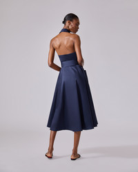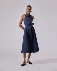 Cut from stretch-cotton sateen, this collared halterneck dress achieves effortless sophistication with faux tortoiseshell buttons and a waist-cinching sash. Buttoned front Low-cut back Two buttoned front hip pockets SKU E2511N503STS SIZE & FIT Slim fit bodice, A-line midi skirt, removable belt Midweight stretchy cotton Model is 180cm/ 5’11” and is wearing a US 2 Bust: 31" Waist: 23" Hips: 34.5" COMPOSITION & CARE 96% Cotton, 4% Elastane Washing Instructions Dry Clean Only Made in Italy