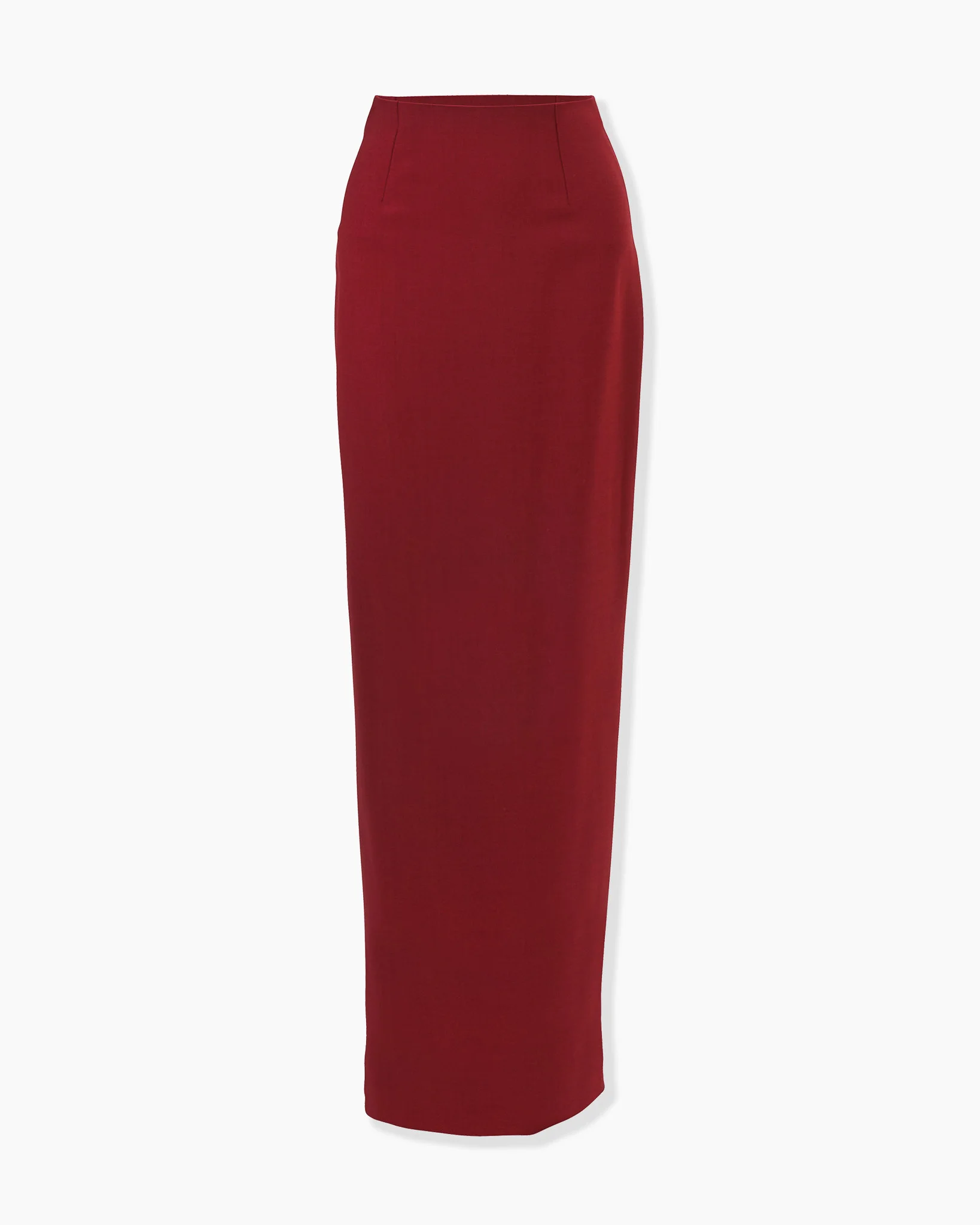 Cut from bi-stretch wool in Rioja red, this floor-length column skirt forms a sophisticated ensemble with its matching Sleeveless Cropped Top. Back slit Concealed zip fastening at the back SKU S2611N310BWT SIZE & FIT Regular fit Heavyweight stretch-wool Model is 177cm/ 5’9” and is wearing a US 2 Bust: 34" Waist: 24.5" Hips: 35" COMPOSITION & CARE 97% Virgin Wool 3% Elastane Washing Instructions Dry Clean Only Made in Italy