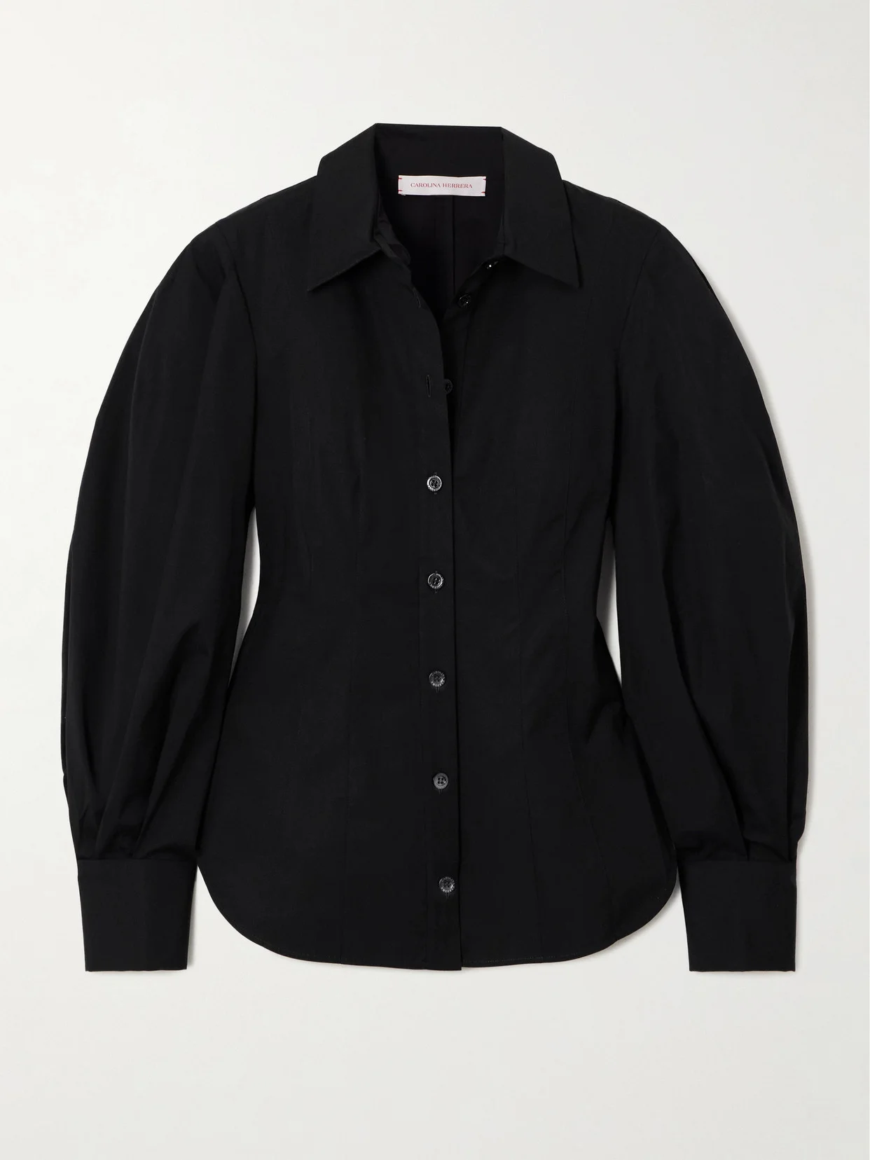 Considered details elevate Carolina Herrera's wardrobe essentials beyond the everyday. This shirt is cut from crisp cotton-blend poplin enhanced with puffed sleeves and pinched cuffs that play on proportions. The brand likes how it looks cinched with a belt.