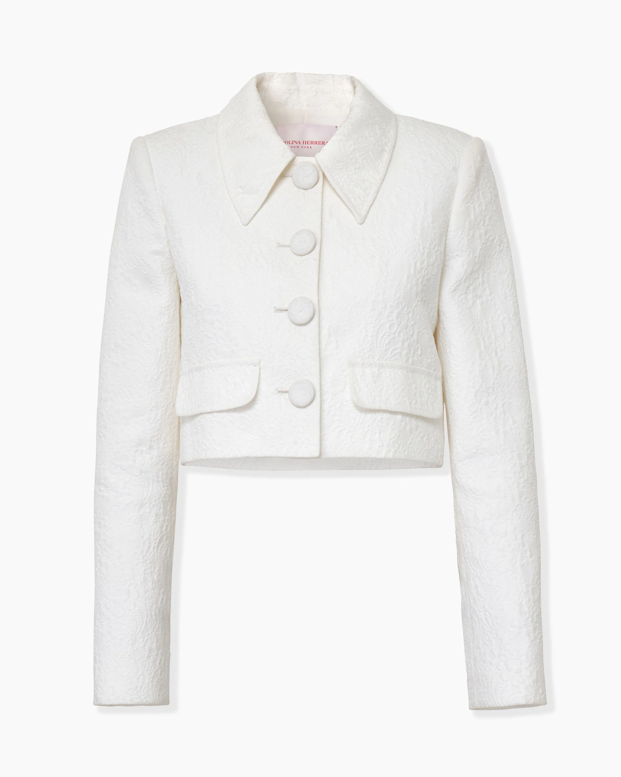 Crafted from textured floral cloque, this boxy jacket contrasts a cropped silhouette with an oversized collar and large-scale buttons – a play of proportions inspired by the 1950's doll collection of Wes Gordon's mother. Wear it with the matching pleated midi skirt. Buttoned front Patch pockets SKU P2511N100CCQ SIZE & FIT Regular fit Midweight cotton blend Model is 178cm/ 5’10” and is wearing a US 2 Bust: 31" Waist: 23" Hips: 33" COMPOSITION & CARE 95% Cotton 5% Viscose Washing Instructions Dry Clean Only Made in Italy