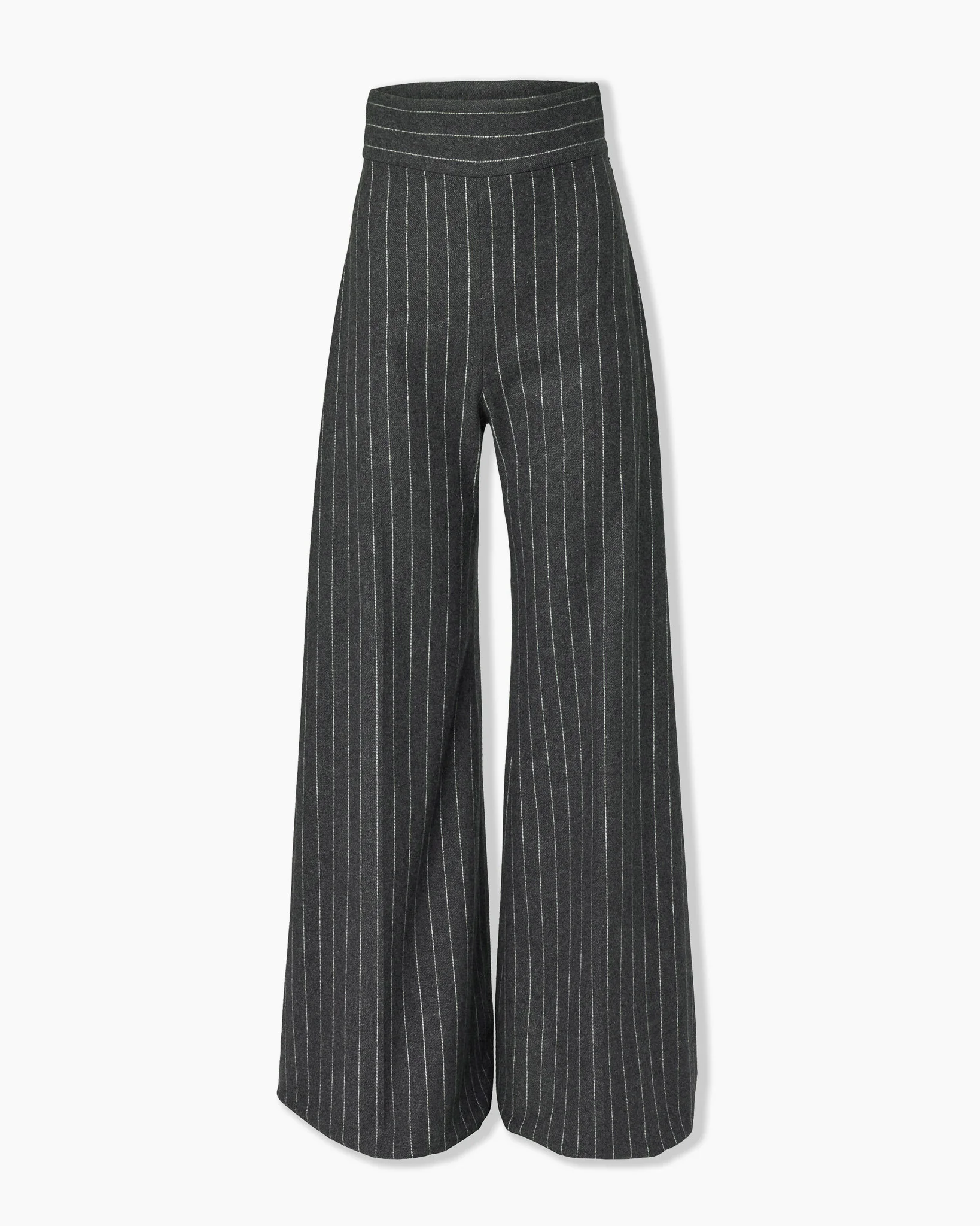 These elegant high-rise pants are tailored from pinstripe flannel with a floor-sweeping, wide-leg silhouette. Wear them with their matching top. Concealed zip fastening at side SKU F2511N414PFN SIZE & FIT High-rise, wide-leg fit Midweight stretch-flannel Model is 179cm/ 5’11” and is wearing a US 2 Bust: 29.5" Waist: 22" Hips: 34.5" COMPOSITION & CARE 46% Reinforced Woven, 36% Linen/Viscose Blend, 17% Recycled Nylon, 1% Elastane Washing Instructions Dry Clean Only Made in Italy