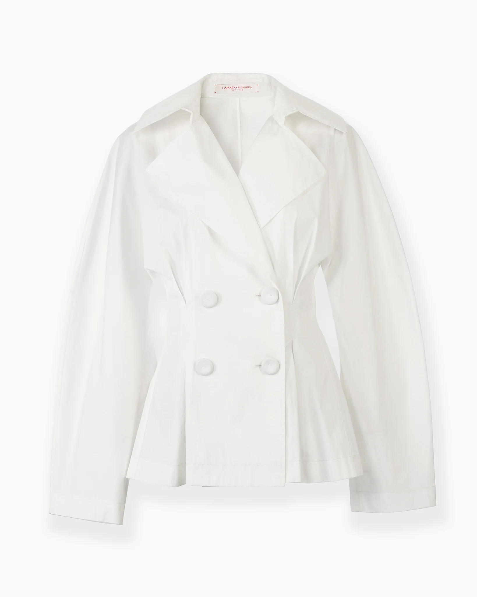 Wide lapels and a double-breasted front, inspired by classic trenchcoat styling, define this stretch-cotton shirt. Voluminous raglan sleeves are beautifully balanced with a pleated waist. Runway style SKU F2511N219SCT SIZE & FIT Slim fit Midweight stretch-cotton Model is 178cm/ 5’10” and is wearing a US 2 Bust: 32" Waist: 23.5" Hips: 34.5" COMPOSITION & CARE 97% Cotton, 3% Elastane Washing Instructions Dry Clean Only Made in Italy