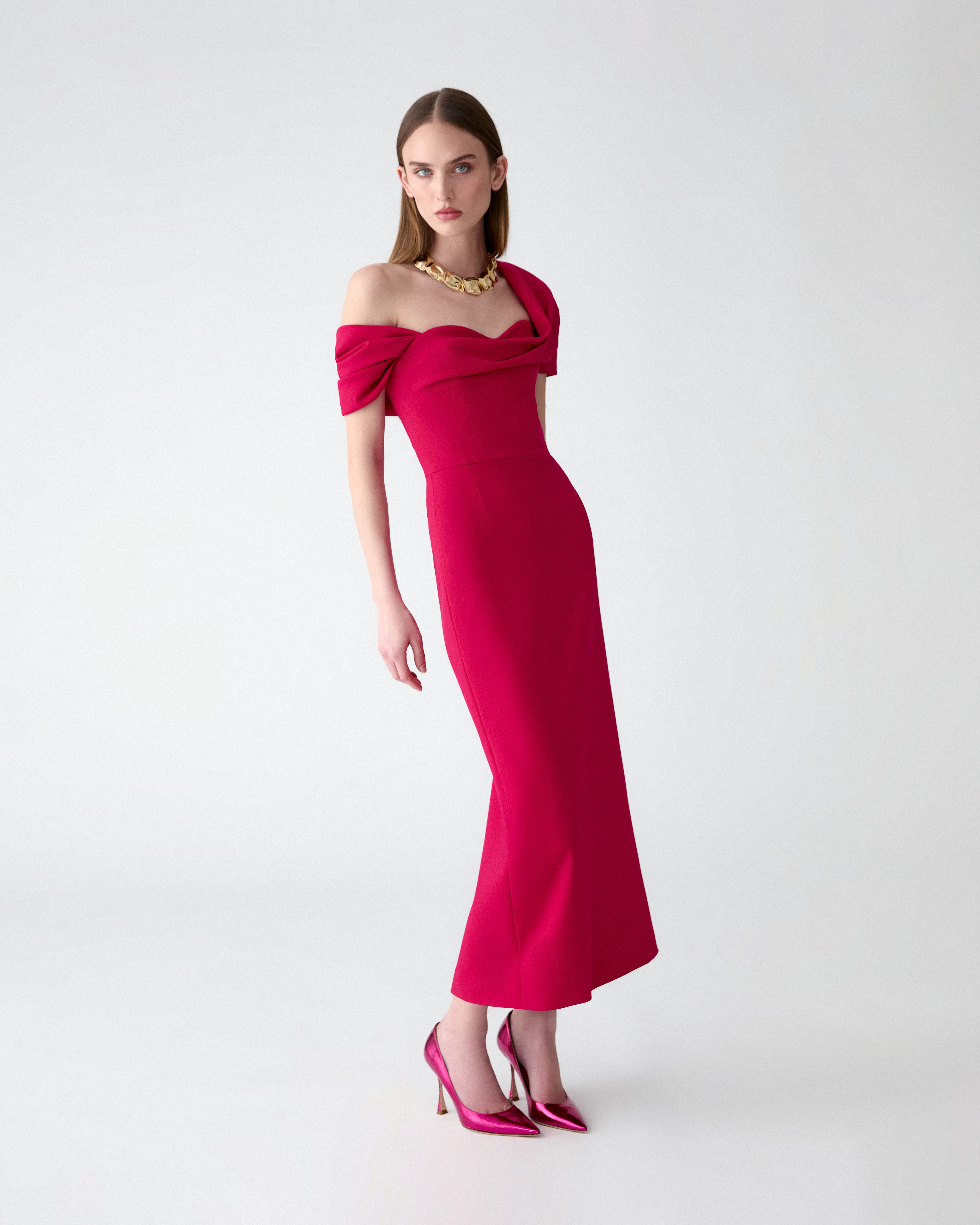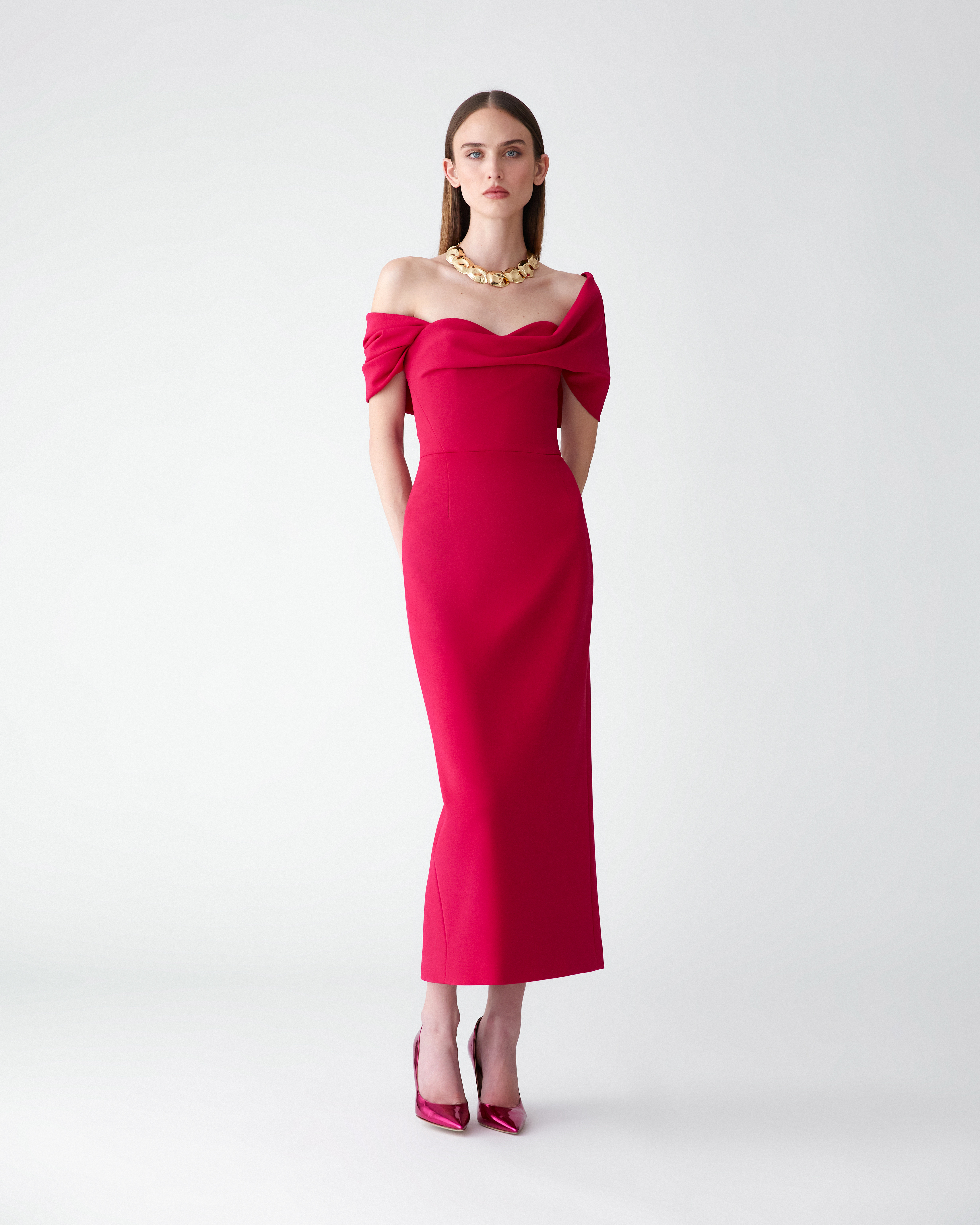 An off-the-shoulder neckline and draped detailing at the bodice bring subtle allure to this column dress, tailored in Italian bi-stretch wool. Off-the-shoulder neckline Concealed zip fastening at the back Back vent SKU C2611N501BWT SIZE & FIT Close-fitting column silhouette, midi length Heavyweight stretch-wool Model is 178cm/ 5’10” and is wearing a US 2 Bust: 32" Waist: 23.5" Hips: 34.5" COMPOSITION & CARE 97% Virgin Wool 3% Elastane Washing Instructions Dry Clean Only Made in Italy