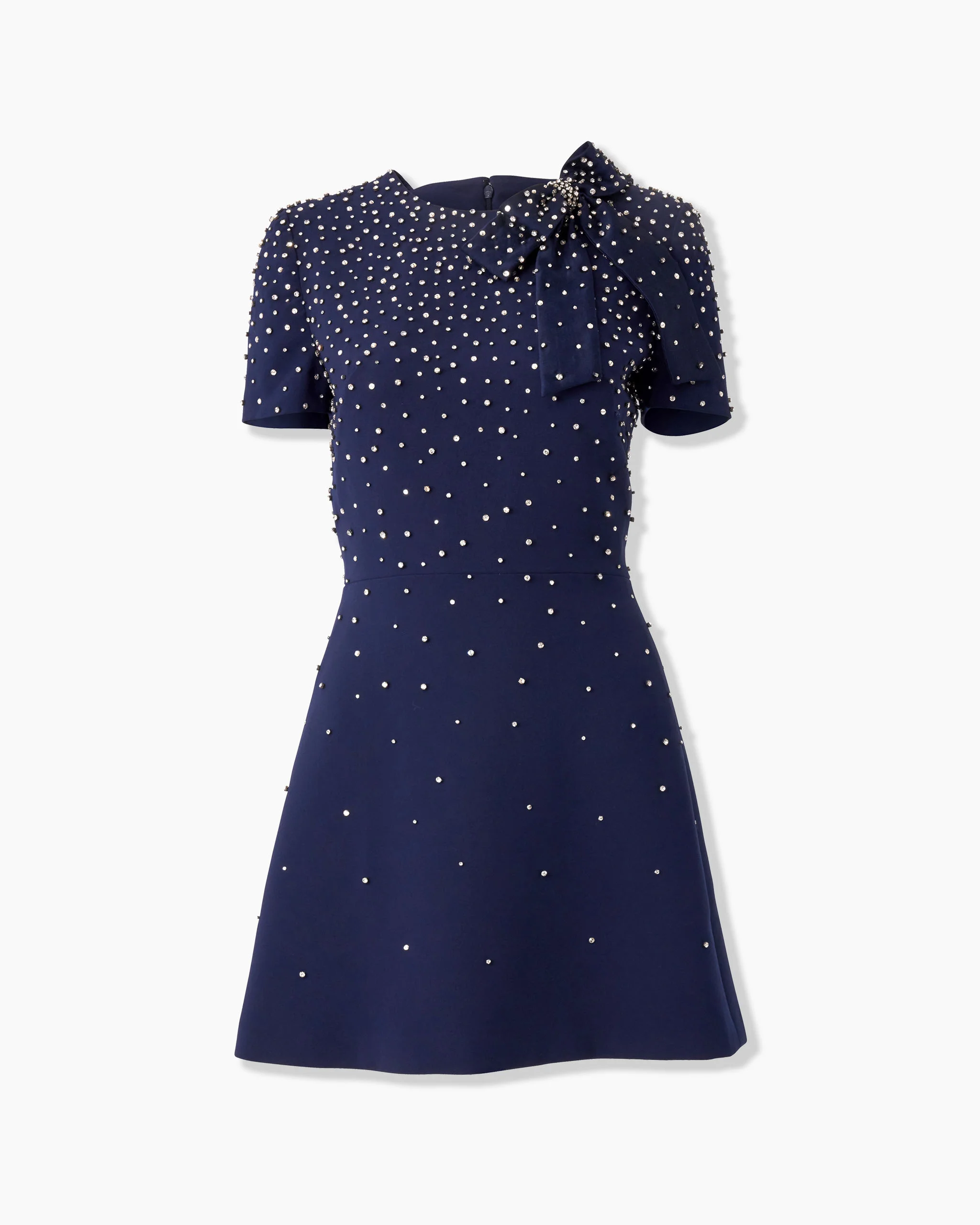 Clusters of embroidered crystals give this crepe mini dress the appearance of a midnight sky, while a satin bow at the collar provides a feminine finish. Concealed zip fastening at the back SKU P2511E558SFR SIZE & FIT Slim-fitted bodice with A-line mini skirt Midweight stretch-crepe Model is 178cm/ 5’10” and is wearing a US 2 Bust: 31" Waist: 23" Hips: 34" COMPOSITION & CARE 92% Polyester 8%Polyutherane Washing Instructions Dry Clean Only