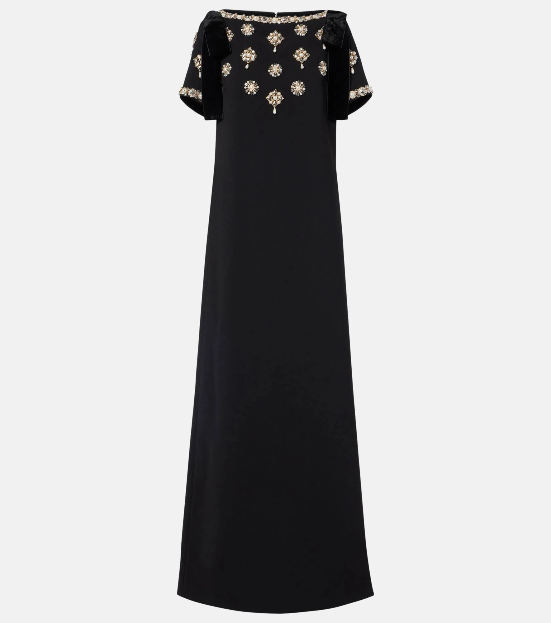 A permanent fixture on the red carpet, Carolina Herrera is credited with the most elegant eveningwear. This gown is tailored to a streamlined silhouette with dazzling embellishments adorning the boat neckline and short-sleeved bodice. Product Details - Material: 92% polyester, 8% polyurethane - Care instructions: dry clean - Made in India - Color: black - Designer color name: Black Multi - Item color: black - Lining: 100% polyester - Closure: concealed zipped back - Long vent - Item number: P01103759 Size & Fit - Fits large to size - we recommend trying one size smaller - Straight fit - Non-stretchy fabric - The model seen in the picture is 178cm-5'10" and wearing a size US 2