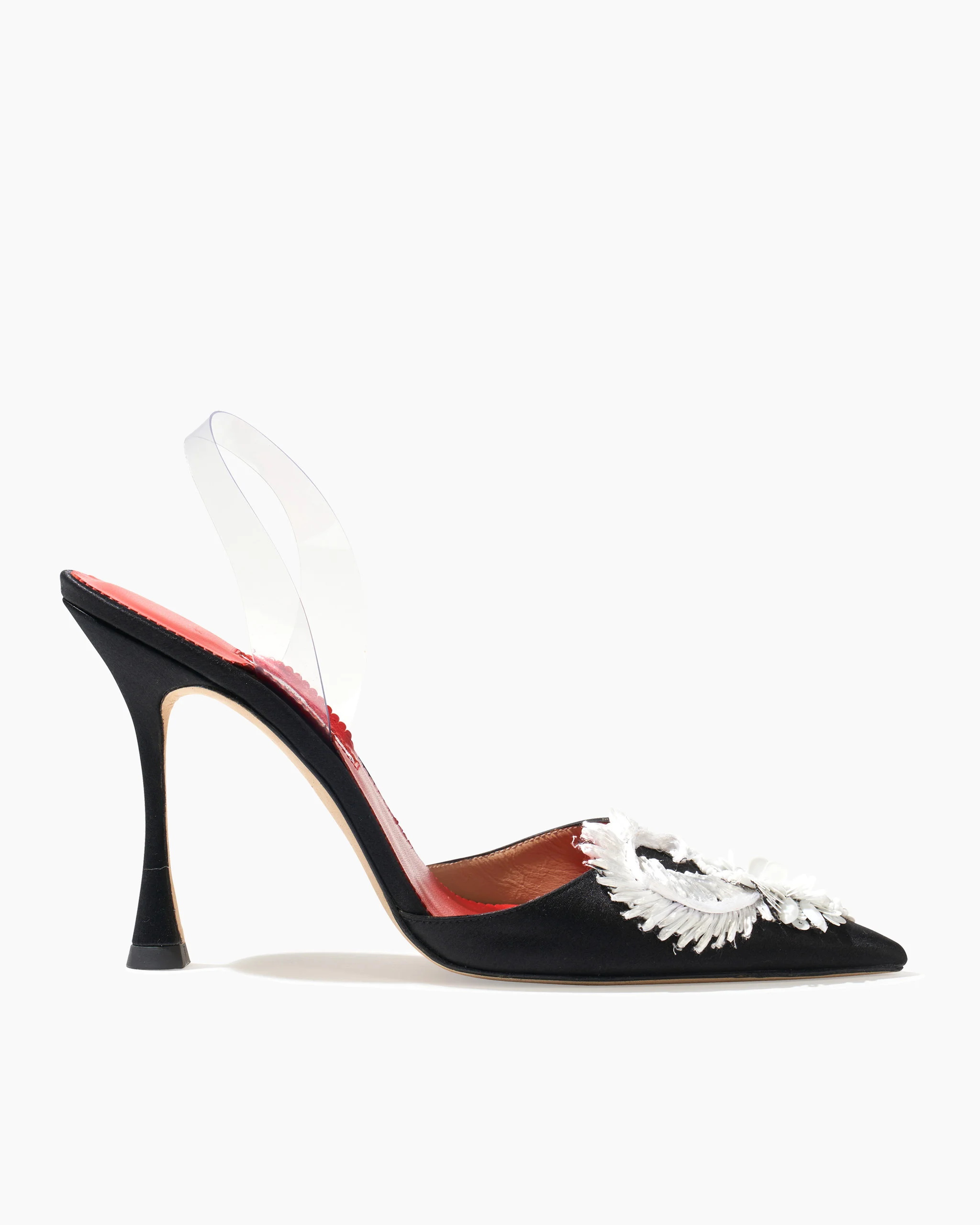 These elegant satin mules feature ornate floral embroidery, realized in raffia, beads, and sequins. Pair them with matching embroidered pieces from the collection. Spool heels Transparent straps Heel height: 65mm SKU S2531E504STN COMPOSITION & CARE 67% Viscose, 33%Silk Washing Instructions Spot Clean Only Made in Spain