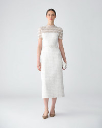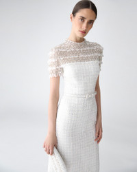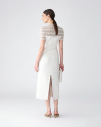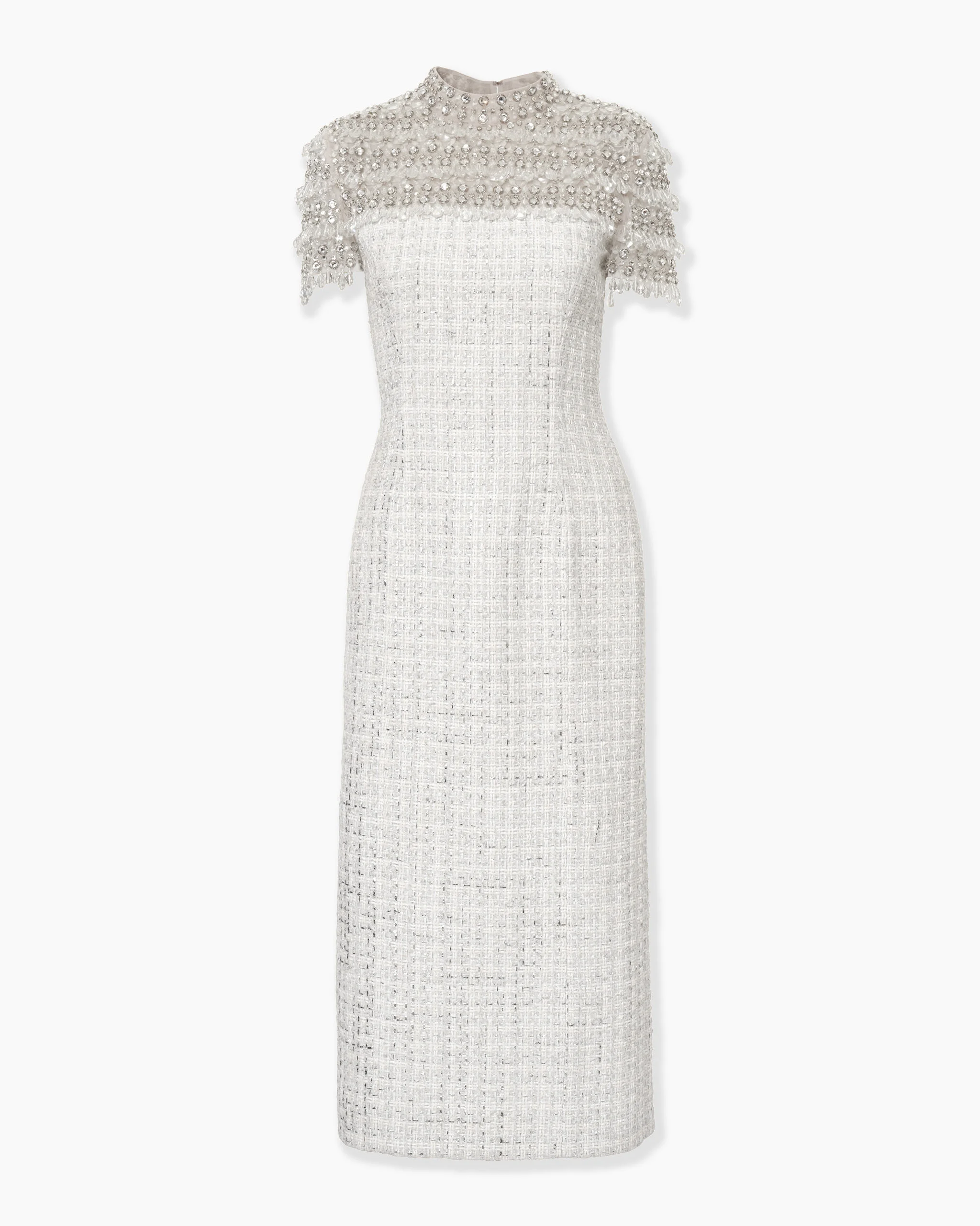 A sheer yoke embroidered with raindrop crystals and rhinestones adds luxurious sparkle to this fitted pencil dress, crafted from soft tweed in a shimmering melange of white and silver tones. Runway style Back slit SKU F2511E531FTD SIZE & FIT Close fit, midi length Midweight tweed Model is 178cm/ 5’10” and is wearing a US 2 Bust: 31" Waist: 23" Hips: 33" COMPOSITION & CARE 28% Nylon, 21% Polyester, 20% Cotton, 14% Virgin Wool, 10% Viscose, 7% Acrylic Washing Instructions Dry Clean Only Made in United States of America