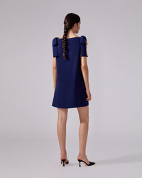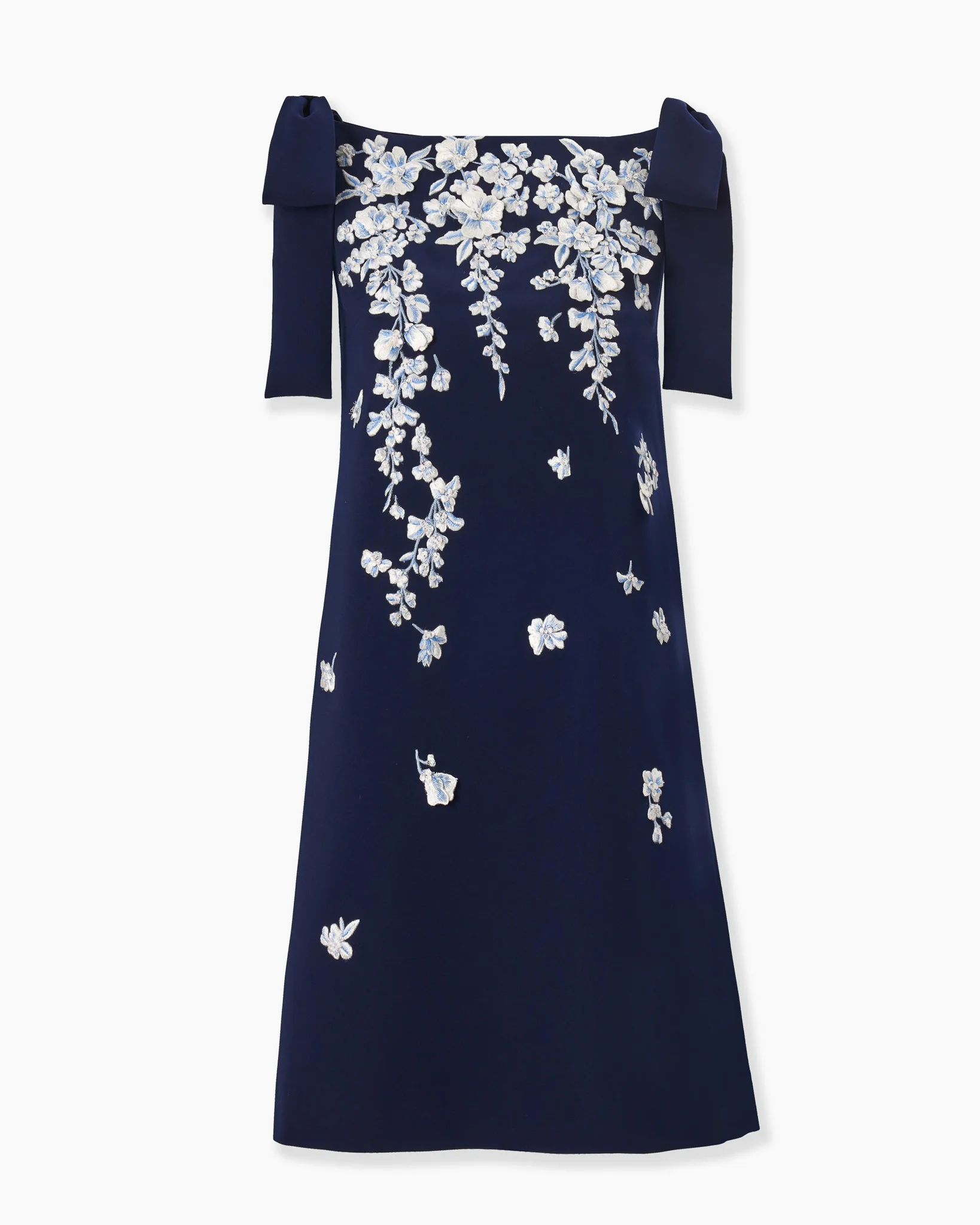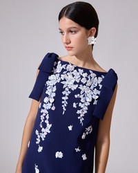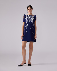 The classic shift is given an ultra-feminine twist with flirty bow shoulders and elaborate wisteria embroidery, realized in thread, crystal, and beads. Decorative bows at the shoulders Concealed zip fastening at the back SKU E2511E523SFR SIZE & FIT Straight fit, mini length Midweight stretchy crepe Model is 178cm/ 5’10” and is wearing a US 2 Bust: 30" Waist: 23" Hips: 35" COMPOSITION & CARE 92% Polyester 8% Polyurethane Washing Instructions Dry Clean Only