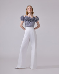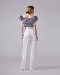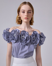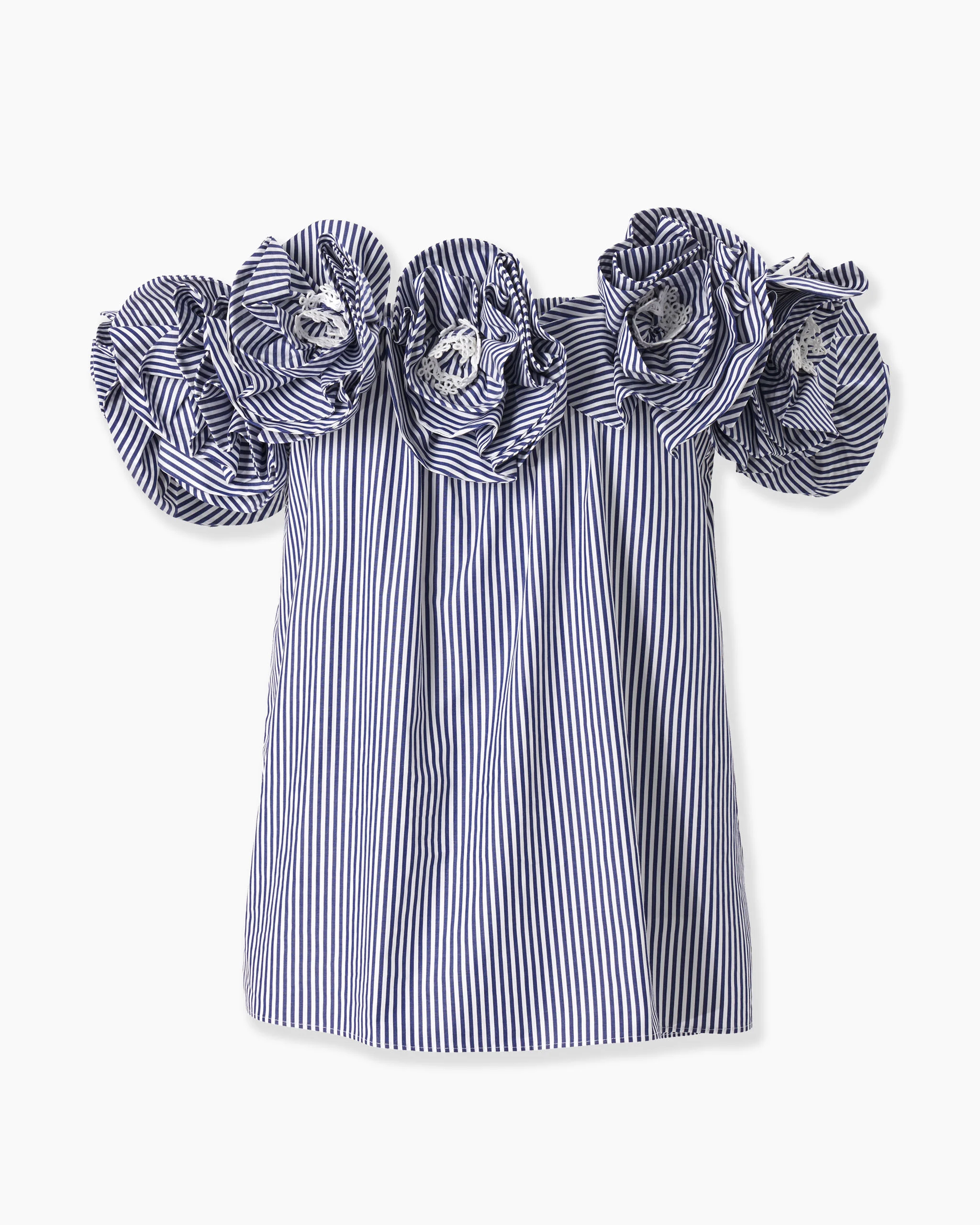 Rosette ruffles with embroidered lace centers add romantic flair to this striped cotton off-the-shoulder top. Elasticized off-the-shoulder neckline SKU E2511E216SCS SIZE & FIT Off-the-shoulder loose fit Midweight non-stretchy cotton Model is 178cm/ 5’10” and is wearing a US 2 Bust: 31" Waist: 23" Hips: 34" COMPOSITION & CARE 100% Cotton Washing Instructions Dry Clean Only