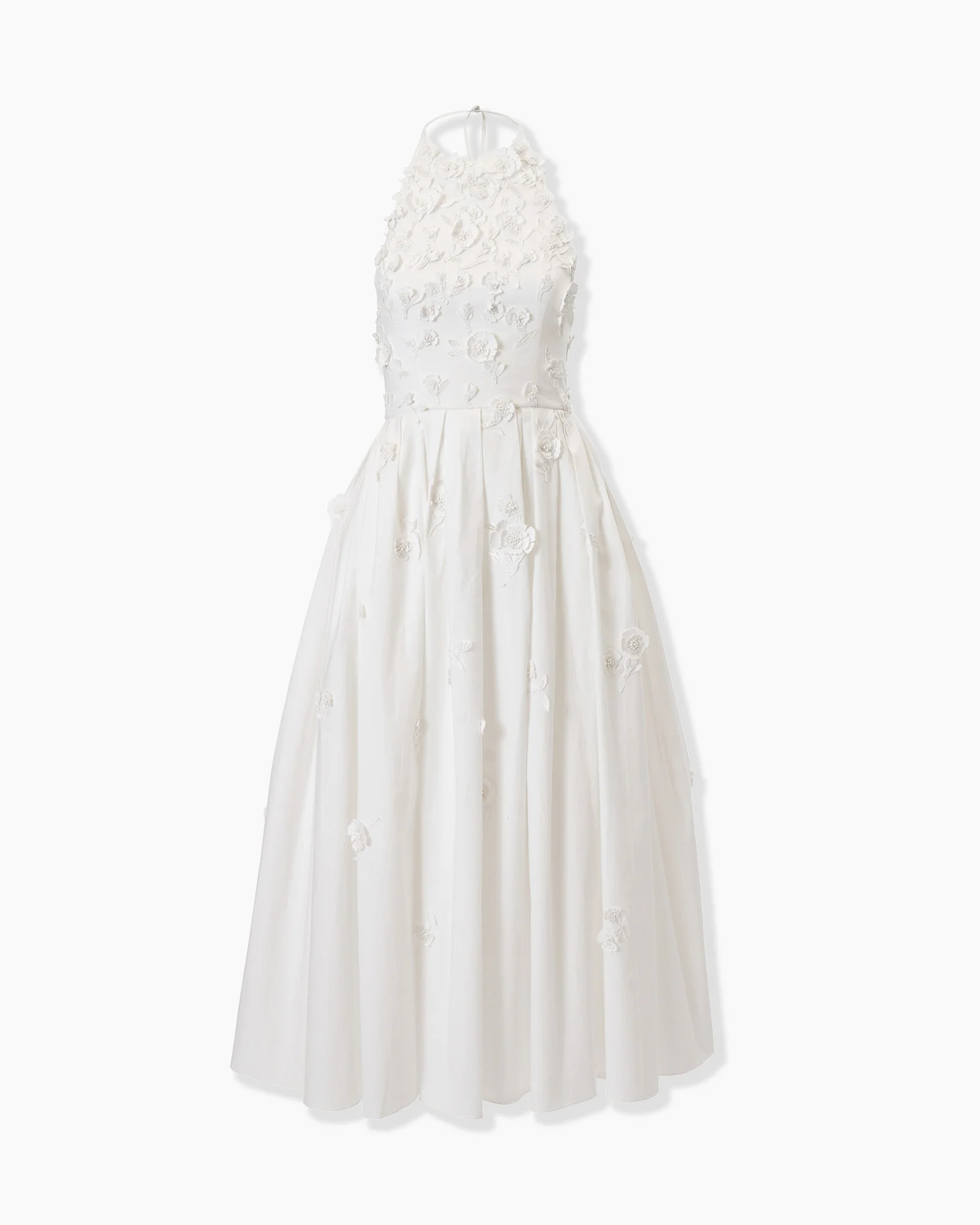 Tonal carnation appliques are embroidered down the halter bodice and pleated skirt of this stretch-cotton A-line dress. The open back reveals a flash of skin. Concealed zip fastening at the back SKU S2611E535SCT SIZE & FIT Close-fitting up to the waist, midi skirt Midweight stretch-cotton Model is 180cm/ 5’7” and is wearing a US 2 Bust: 29" Waist: 24" Hips: 33.5" COMPOSITION & CARE 97% Cotton 3%Polyurethane Washing Instructions Dry Clean Only Made in India