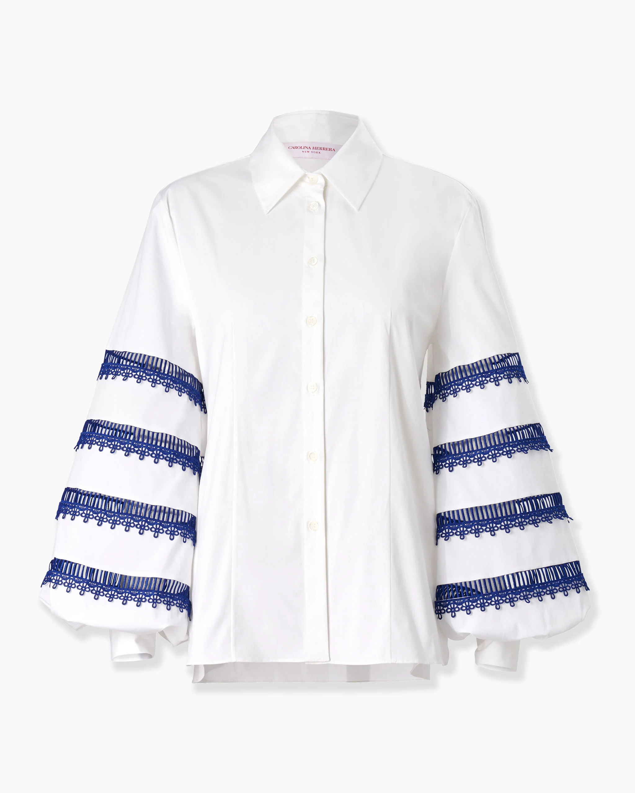 Voluminous sleeves with sheer lace inserts create an eye-catching silhouette. Point collar Buttoned front and cuffs SKU E2511E218SCT SIZE & FIT Regular fit with voluminous sleeves Midweight stretchy cotton Model is 180cm/ 5’11” and is wearing a US 2 Bust: 31" Waist: 23" Hips: 34.5" COMPOSITION & CARE 97% Cotton 3% Polyutherane Washing Instructions Dry Clean Only