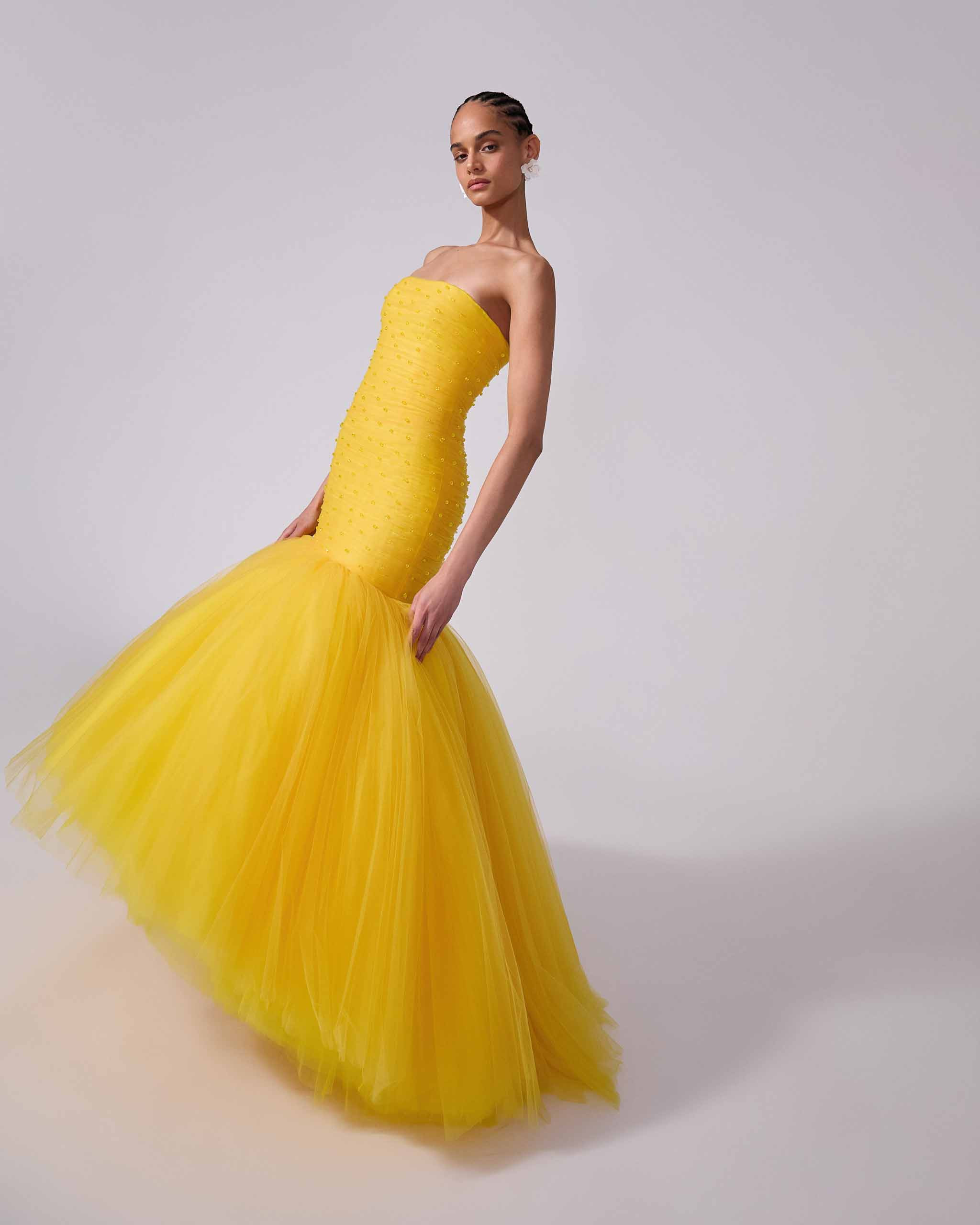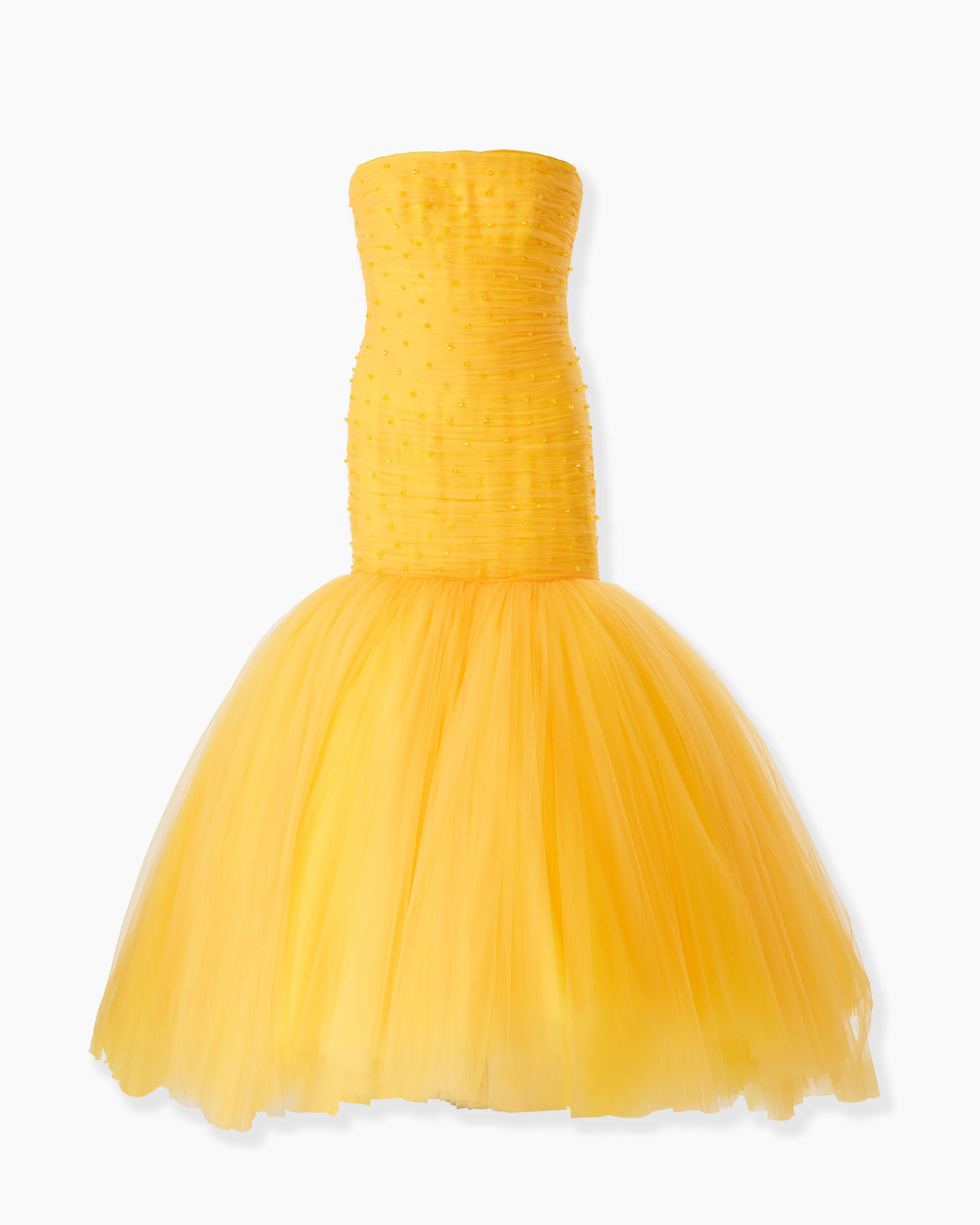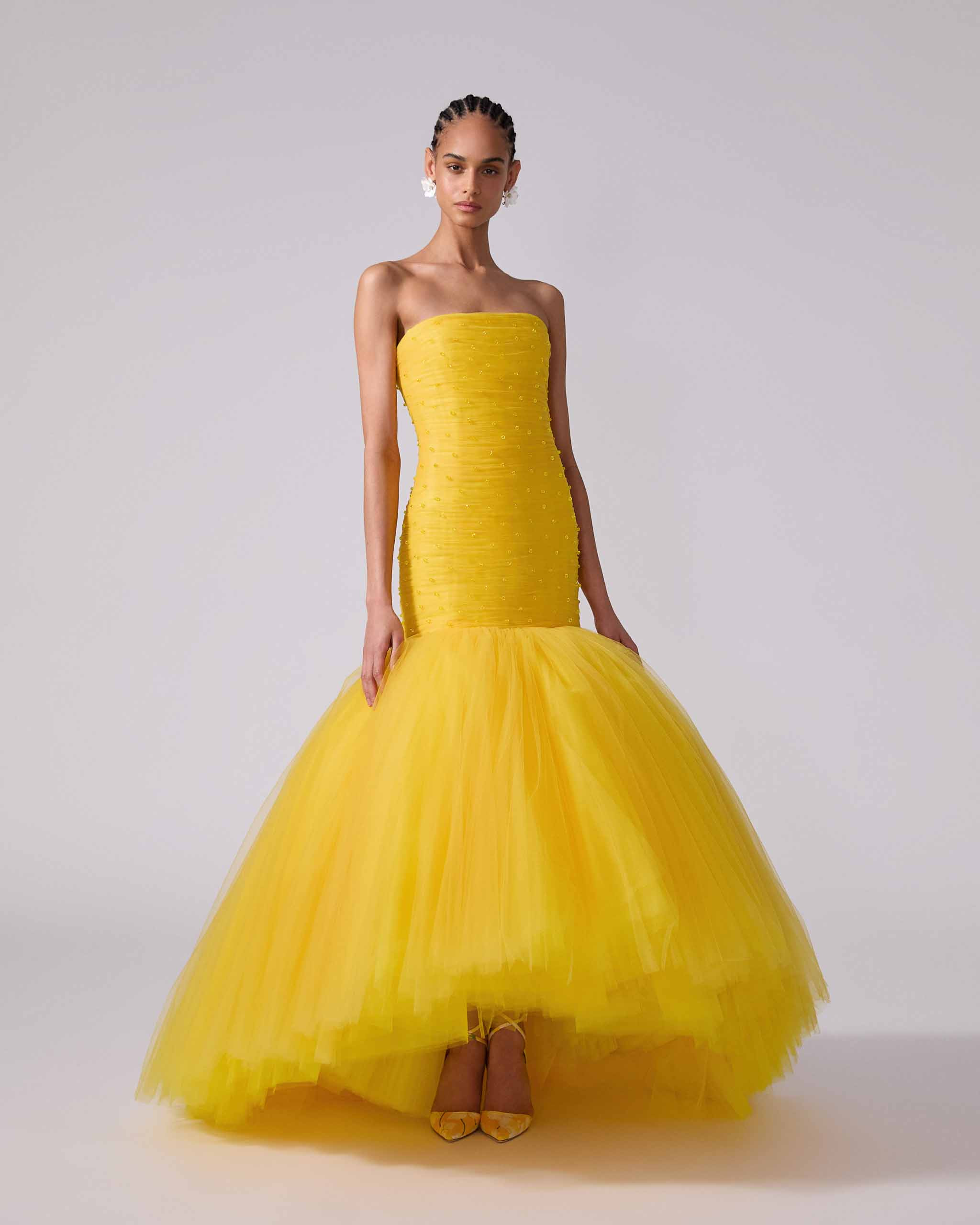 This showstopping taxi-cab yellow gown is embellished with sparkling beads on the ruched bodice, which kicks out into a dramatic multi-layered trumpet hem. Runway style Strapless Concealed zip fastening at the back SKU S2511E715NTU SIZE & FIT Close-fitting up to the thigh, voluminous hem Embellished tulle with lining Model is 175cm/ 5’9” and is wearing a US 2 Bust: 30" Waist: 23" Hips: 34" COMPOSITION & CARE 100% Nylon / Polyamid Washing Instructions Dry Clean Only Made in United States of America
