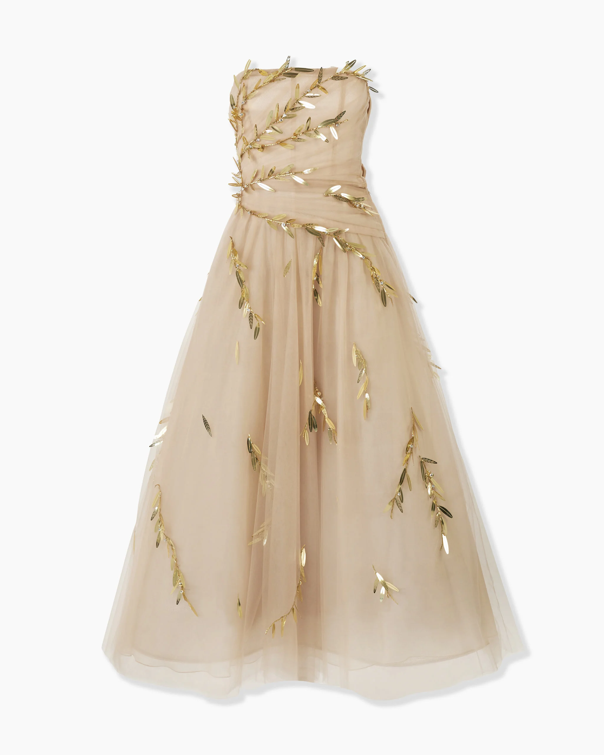 Capturing the mystical beauty and femininity of the season, this ethereal dress is crafted from layers of tulle draped across the bodice and falling into a voluminous skirt. Gilded olive leaves, embroidered with crystal centers, shimmer across it like scattered light. Boning at the bodice Petticoat at the skirt Concealed zip closure at the side Fully lined SKU R2611E539NTU SIZE & FIT Close-fitting bodice, voluminous skirt Lightweight embellished tulle Model is 175cm/ 5’9” and is wearing a US 2 Bust: 31.5" Waist: 23.5" Hips: 34.5" COMPOSITION & CARE 100% Nylon Washing Instructions Dry Clean Only Made in United States of America