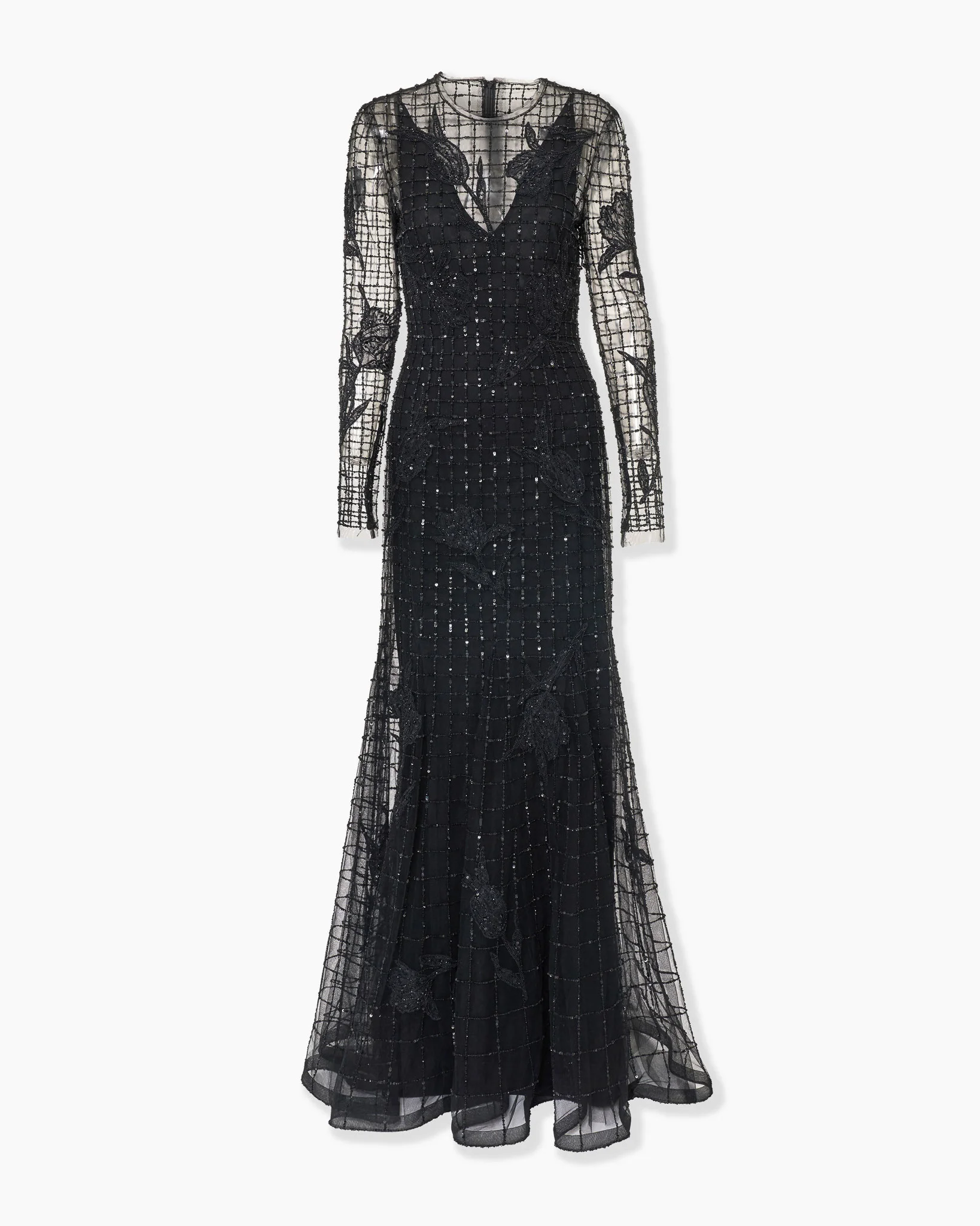 This stunning trumpet gown is crafted from sheer tulle in a gridded cage design, adorned with hand-embroidered jet beads that grow in size as the skirt flares. Embroidered tulip motifs echo the season’s theme, creating a refined interplay of opacity and transparency. Runway style A-line skirt with train Removable lining SKU F2511E715NTU SIZE & FIT Close fit, extra-long length Lightweight embellished tulle Model is 179cm/ 5’11” and is wearing a US 2 Bust: 33" Waist: 23" Hips: 34.5" COMPOSITION & CARE 100% Nylon Washing Instructions Dry Clean Only