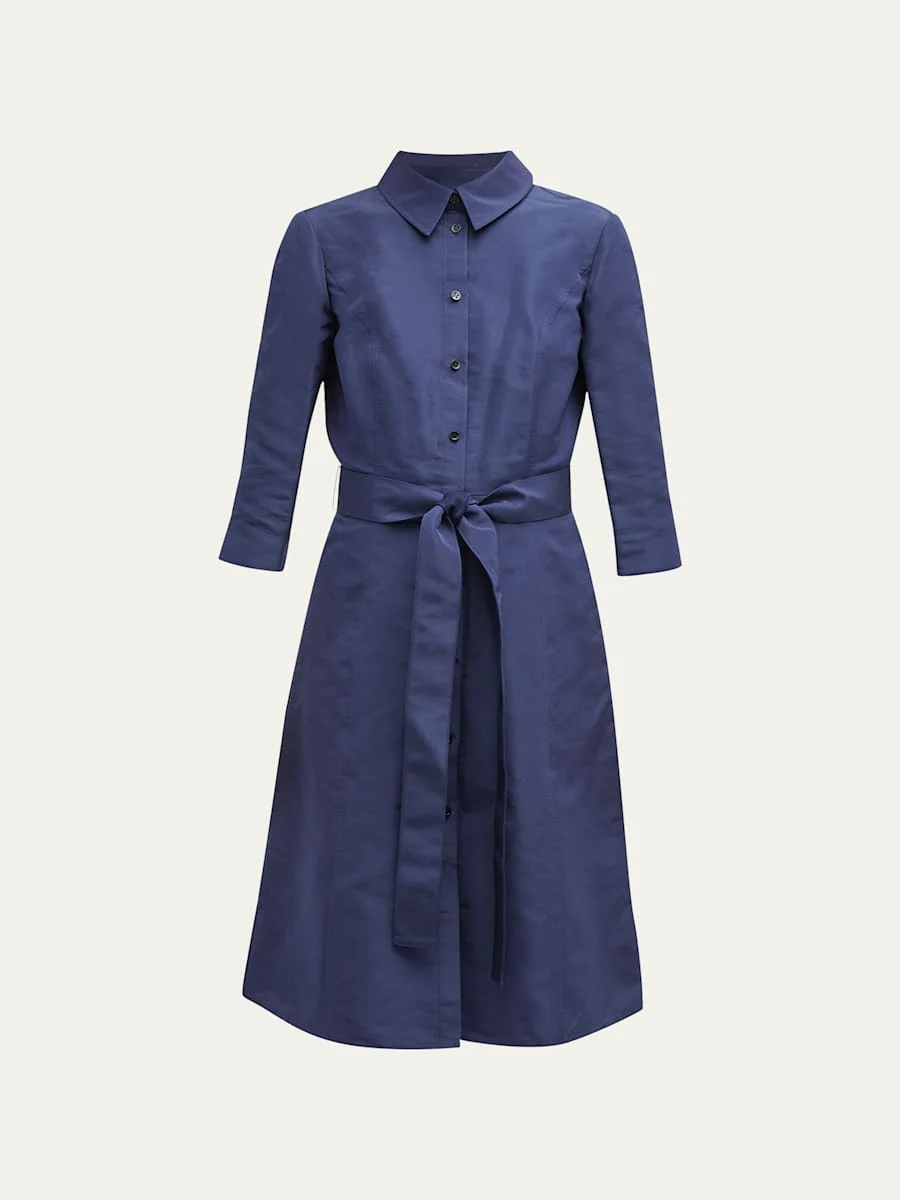Carolina Herrera shirtdress in silk faille. Approx. length: 43" from shoulder to hem. Collar. Threequarter sleeves. Aline silhouette. Hem hits about at the knee. Silk. Dry clean. Made in Portugal.