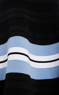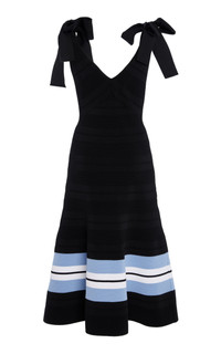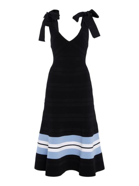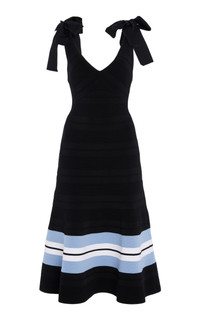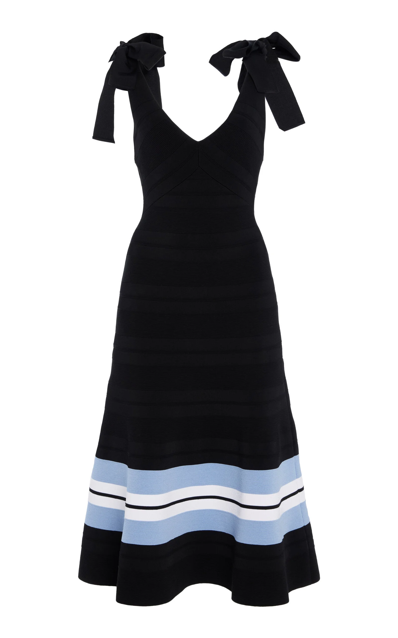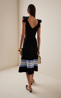 PRODUCT DETAILS - Bow straps (sewn), V-neck, slim fit, flared hem, midi - Slip on - Unlined - Composition: 40% Viscose, 34% Cotton, 23% Polyamide, 3% Elastane - Color: Black Multi - Dry clean only - Pre-Fall '25