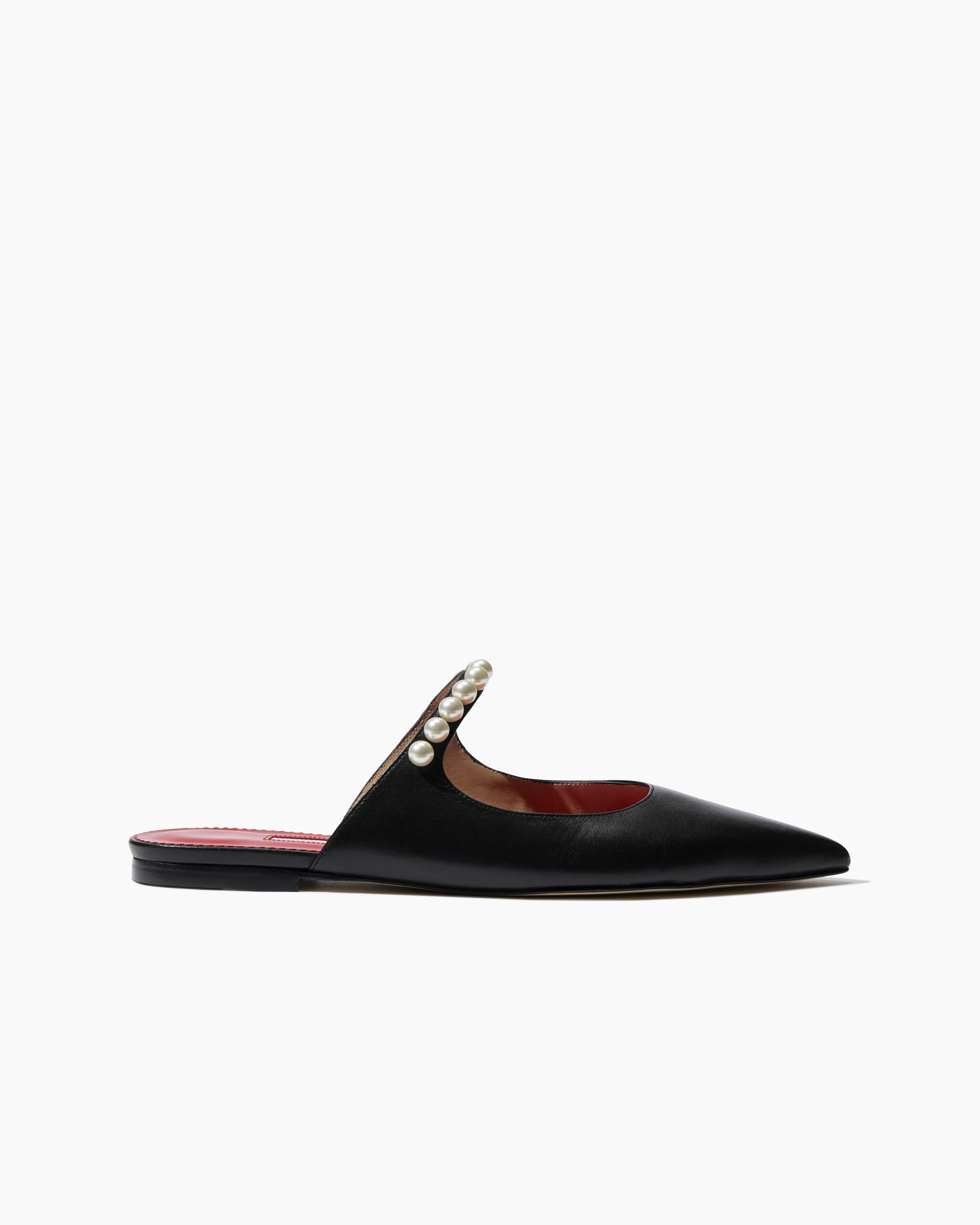 Crafted of smooth leather, these elegant flat mules feature a pearl-embellished strap and pointed toe. COMPOSITION & CARE 100% Goat Leather Washing Instructions Clean with a soft, dry cloth Made In Spain SKU C2534N500LEA