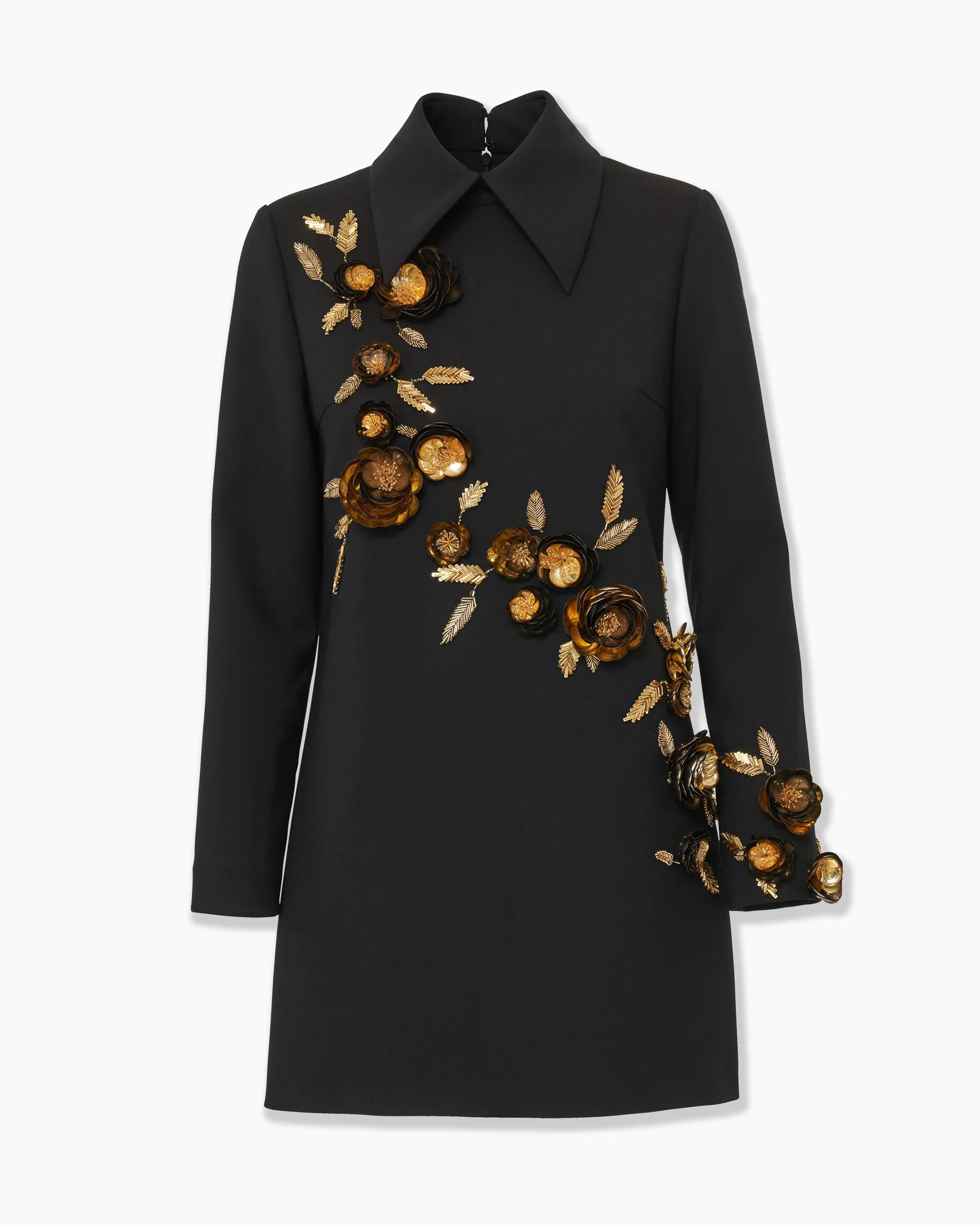 This stretch-wool mini dress is wrapped in opulent, burnished gold floral embroidery inspired by Creative Director Wes Gordon's vision of an autumn garden. A pointed collar gives it a sharp, tailored edge. Runway style Concealed zip fastening at the back SKU F2511E527BWT SIZE & FIT Slim fit bodice with mini skirt Heavyweight stretch-wool Model is 179cm/ 5’11” and is wearing a US 2 Bust: 29.5" Waist: 22" Hips: 34.5" COMPOSITION & CARE 97% Virgin Wool, 3% Elastane Washing Instructions Dry Clean Only Made in United States of America