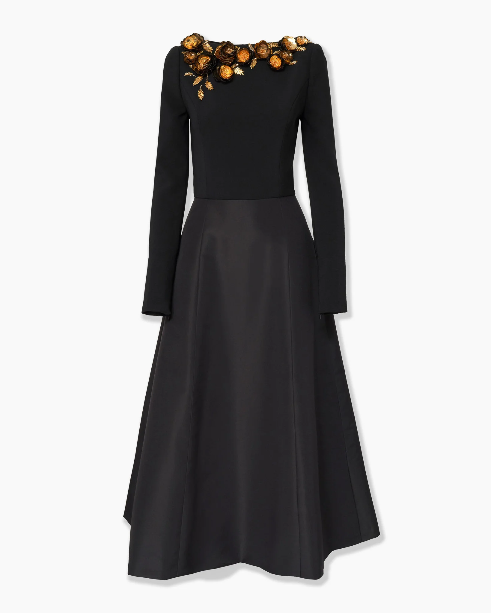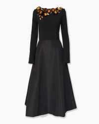 This sophisticated midi dress is embellished with burnished gold floral embroidery, inspired by Creative Director Wes Gordon's vision of an autumn garden. The crepe bodice and silk faille skirt offer the perfect balance of fit and drape. Cutout back SKU F2511E528SFA SIZE & FIT Close-fitting bodice, voluminous skirt Midweight silk-faille Model is 178cm/ 5’10” and is wearing a US 2 Bust: 31" Waist: 23" Hips: 33" COMPOSITION & CARE 100% Silk Washing Instructions Dry Clean Only Made in United States of America