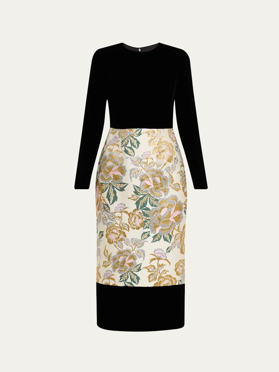 Carolina Herrera mixed-media dress features a floral jacquard skirt panel with metallic thread accents Crew neckline Long sleeves Center-cut back vent Hem falls below the knee Sheath silhouette Invisible back zipper Polyester/metallic fibers/nylon/polyamide Dry clean Made in USA Online Inquiries: BGS21_BA9JS| Store Inquiries: #5021100