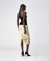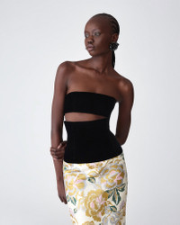 A cutout velvet bodice gives this opulent dress an alluring look. The skirt is crafted from metallic jacquard, with a vintage-inspired floral pattern that glitters with golden accents. Runway style Front cutout Concealed zip closure at the back SKU F2511N566FLJ SIZE & FIT Close-fitting column silhouette, midi length Midweight jacquard Model is 179cm/ 5’11” and is wearing a US 2 Bust: 29.5" Waist: 22" Hips: 34.5" COMPOSITION & CARE 79% Polyester, 11% Polyester Metal, 10% Nylon Washing Instructions Dry Clean Only Made in United States of America