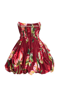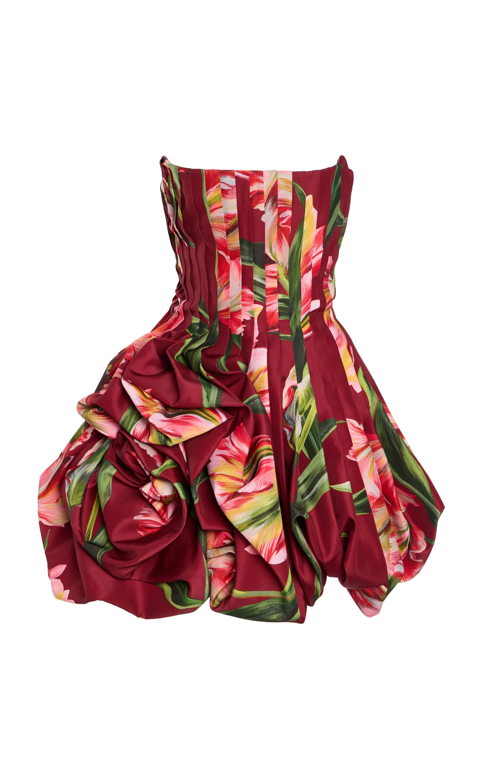 PRODUCT DETAILS - Fall '25 - Slim fit, strapless, pleated bodice, draped skirt - Zipper fastening - Composition: 100% Polyester - Color: Garnet Multi - Dry clean - Made in the USA
