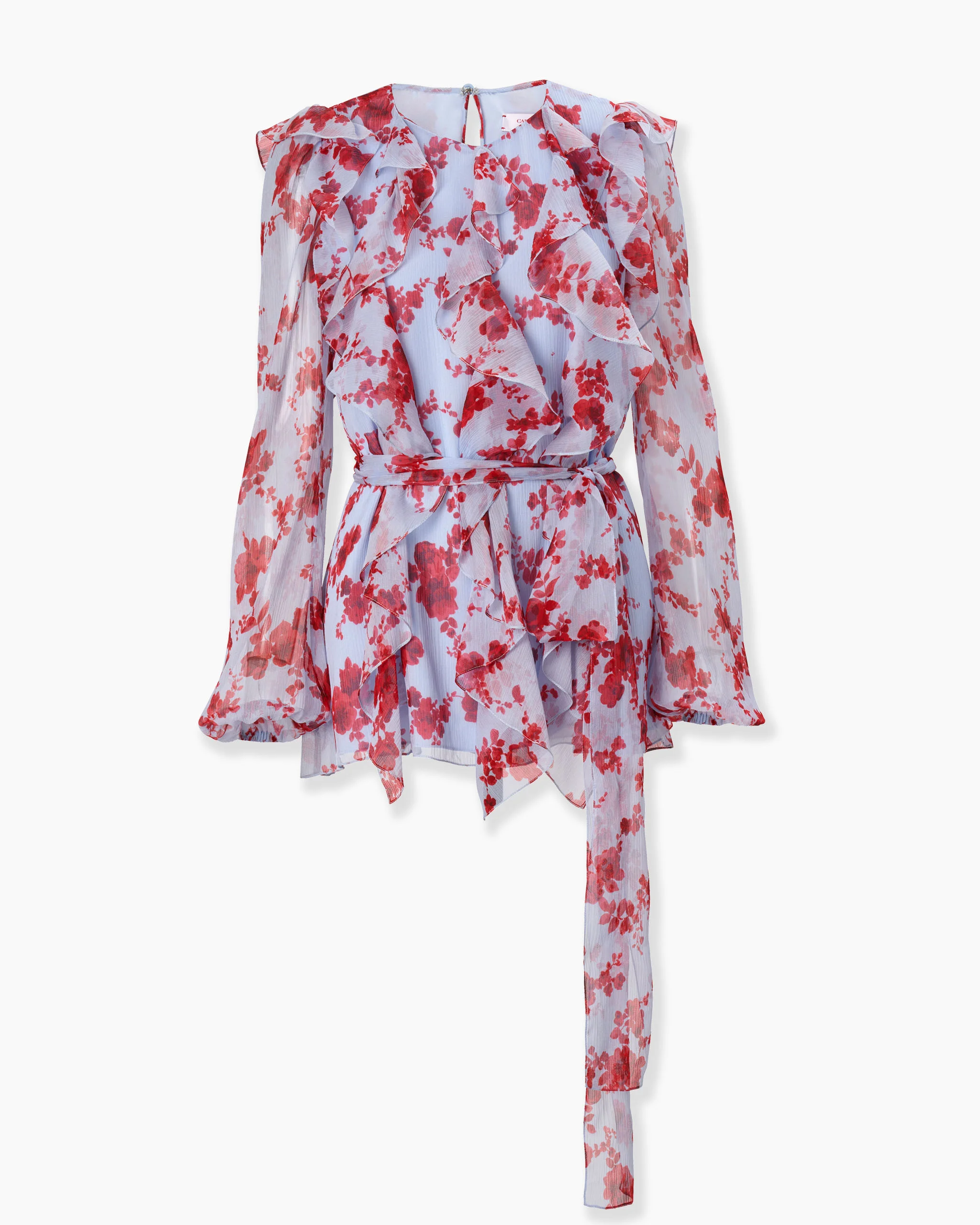 Delicate ruffles cascade down this floaty silk-chiffon top, detailed with billowing sleeves, a sash waist and a romantic floral print. Sheer sleeves Keyhole back with button Partially lined SKU E2511N210WLH SIZE & FIT Slightly loose fit, self belt Lightweight silk-chiffon Model is 178cm/ 5’10” and is wearing a US 2 Bust: 30" Waist: 23" Hips: 35" COMPOSITION & CARE 100% SIlk Washing Instructions Dry Clean Only Made in United States of America