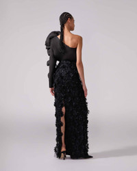 Embroidered floral appliques and sparkling beads adorn this alluring column skirt, finished with a slit at the back. Style it with the Asymmetric Rosette Top, as it was on the runway. Runway style Back slit Concealed zip fastening at the back SKU S2511E309NTU SIZE & FIT High-waisted, slim fit, extra-long length Embellished tulle with lining Model is 175cm/ 5’9” and is wearing a US 2 Bust: 30" Waist: 23" Hips: 34" COMPOSITION & CARE 100% Nylon/Polyamid Washing Instructions Dry Clean Only