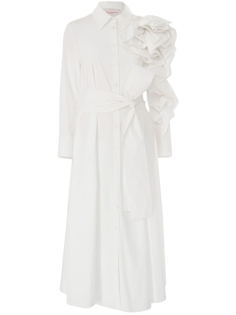 floral-applique midi shirt dress Highlights - White - Front button fastening - Detachable waist belt - Classic collar - Long sleeves Made in United States Composition Cotton 97%, Elastane 3%