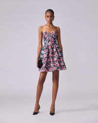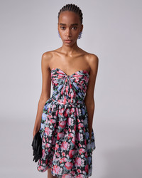 This strapless organza dress wows with contrasting panels of peony prints. Its ruched sweetheart bodice and flared skirt create a stunning silhouette. Concealed zip fastening at the back SKU P2511N542PCO SIZE & FIT Fitted bodice, A-line mini skirt Lightweight crepe Model is 178cm/ 5’10” and is wearing a US 2 Bust: 31" Waist: 23" Hips: 34" COMPOSITION & CARE 100% Silk Washing Instructions Dry Clean Only Made in United States of America