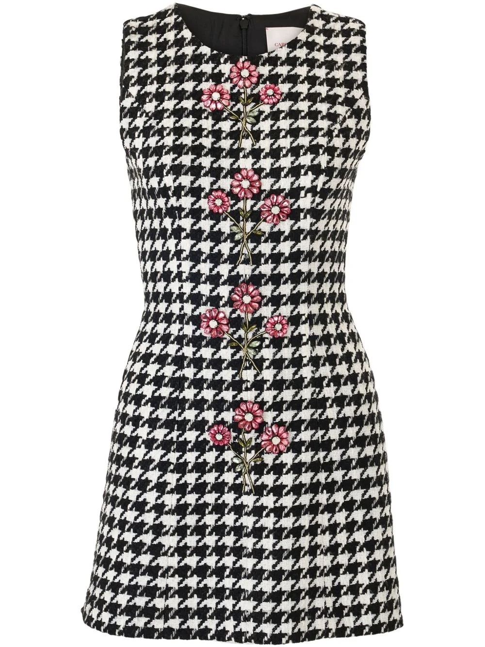 houndstooth-pattern mini dress Highlights - Black - Rear zip fastening - Floral embroidery - Round neck - Sleeveless Made in United States Composition Linen/Flax 35%, Viscose 23%, Cotton 21%, Acetate 16%, Nylon 5%